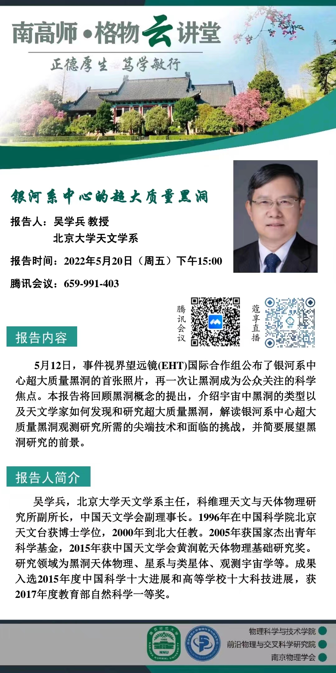 【学术预告】“南高师·格物云讲堂” 银河系中心的超大质量黑洞--吴学兵 教授