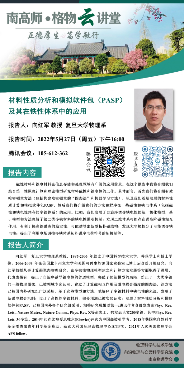 【学术预告】“南高师·格物云讲堂”材料性质分析和模拟软件包(PASP)及其在铁性体系中的应用