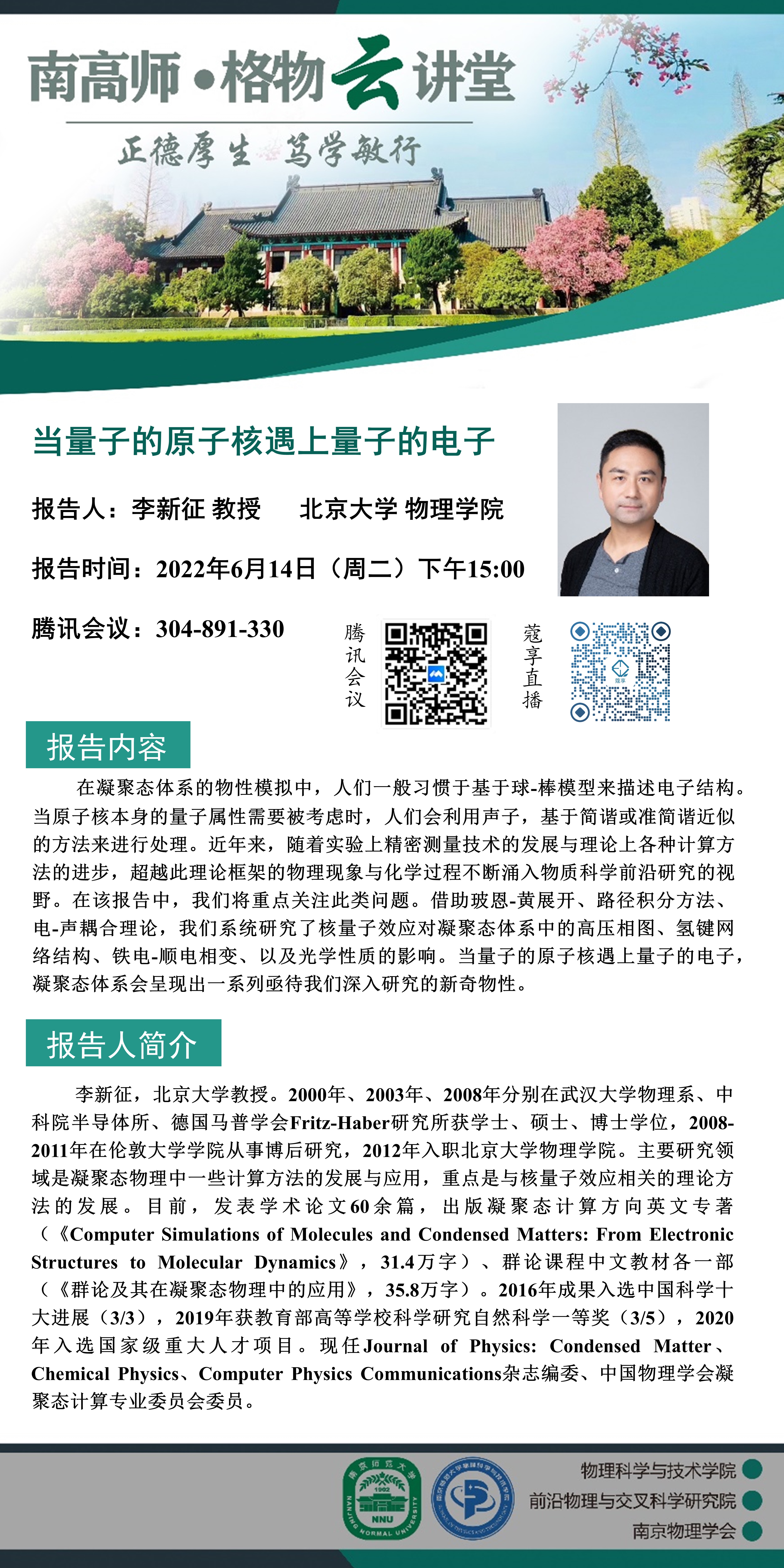 【学术预告】“南高师·格物云讲堂” 当量子的原子核遇上量子的电子--李新征教授
