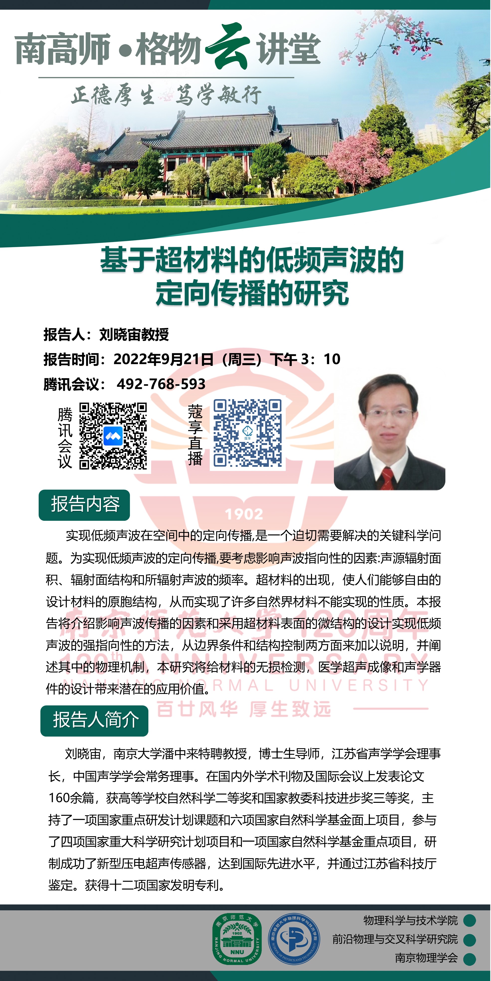 【学术预告】“南高师·格物云讲堂” 基于超材料的低频声波的定向传播的研究--刘晓宙教授