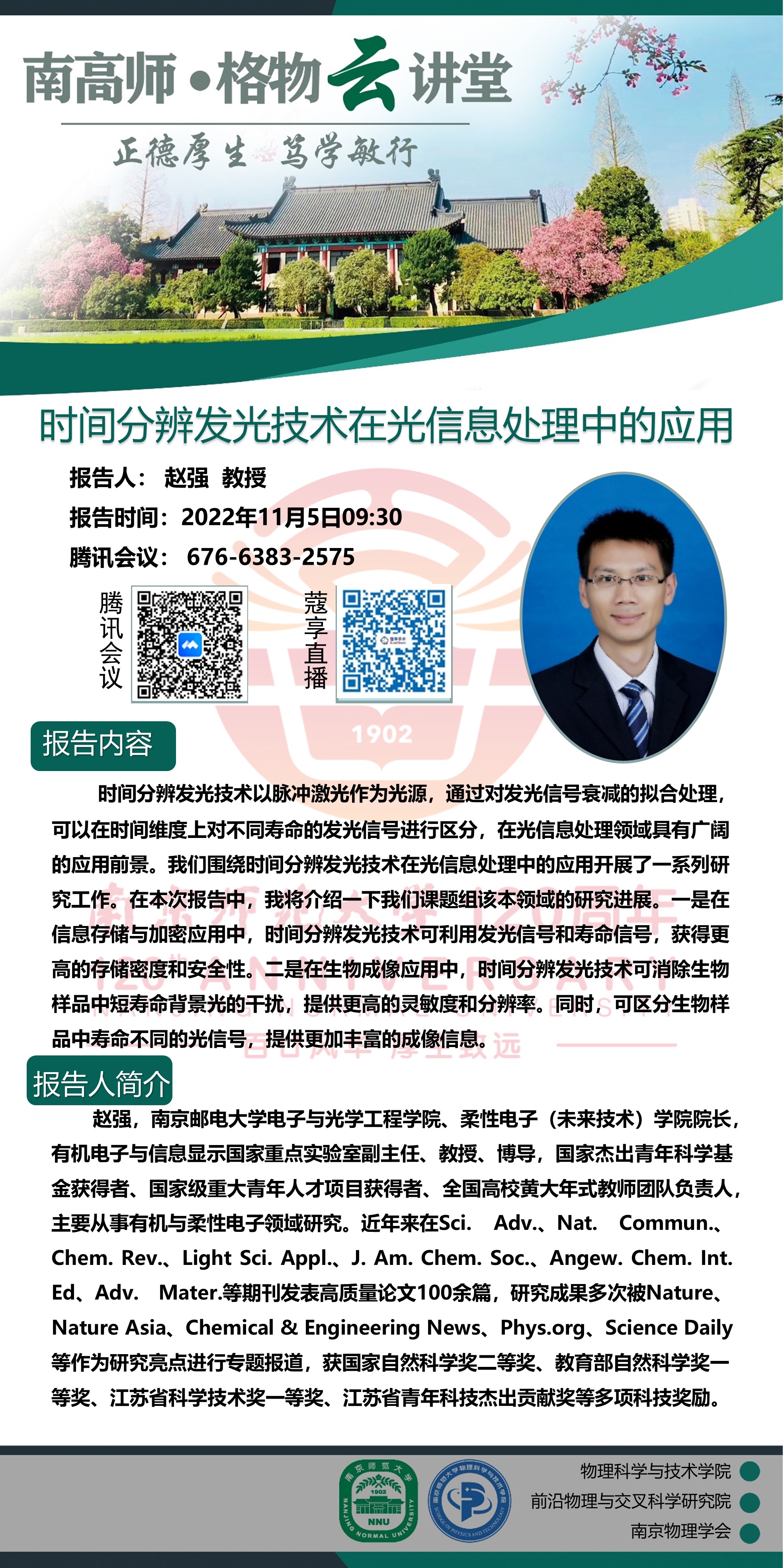 【学术预告】“南高师·格物云讲堂” 时间分辨发光技术在光信息处理中的应用--赵强教授