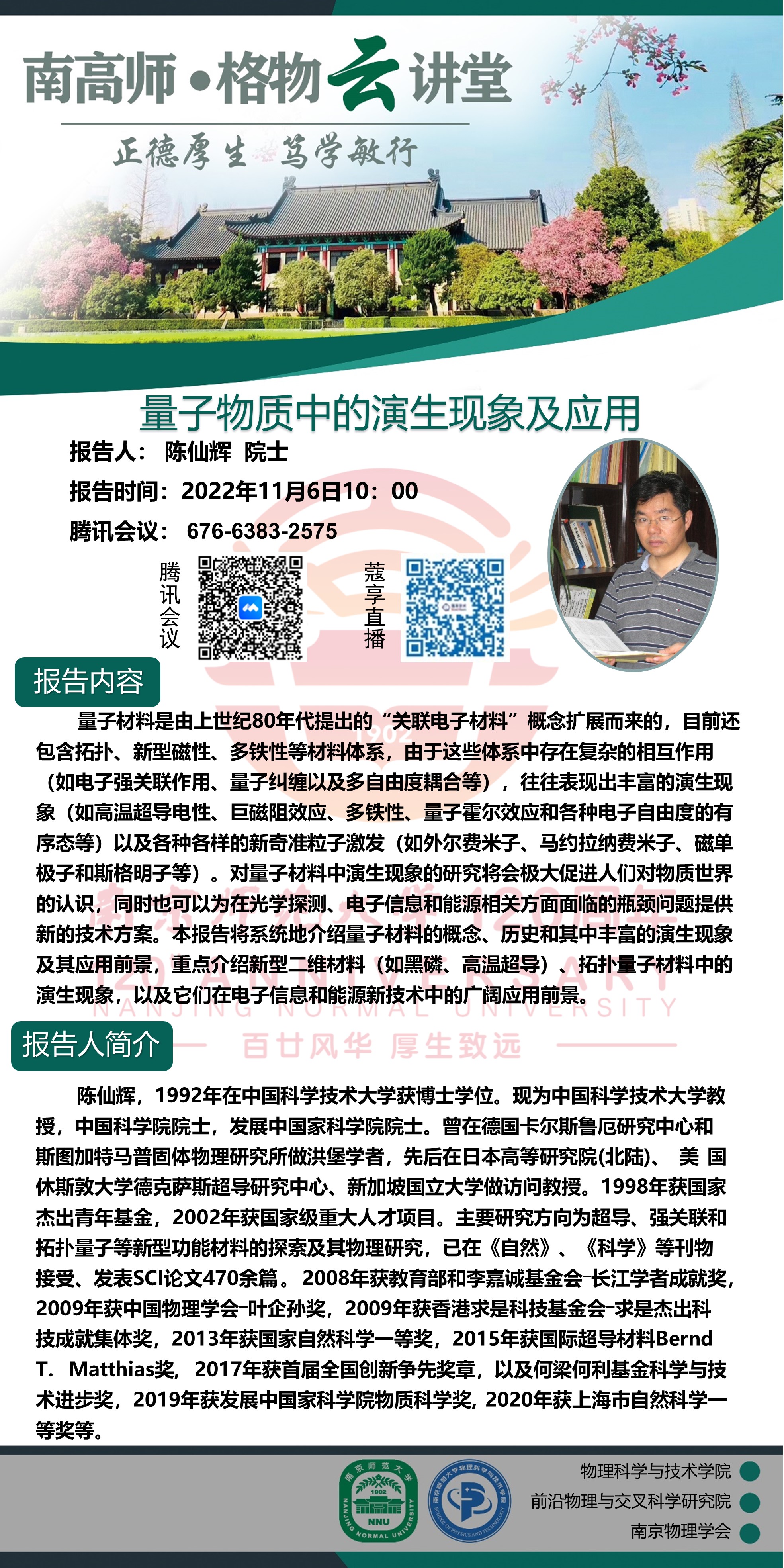 【学术预告】“南高师·格物云讲堂” 量子物质中的演生现象及应用--陈仙辉院士