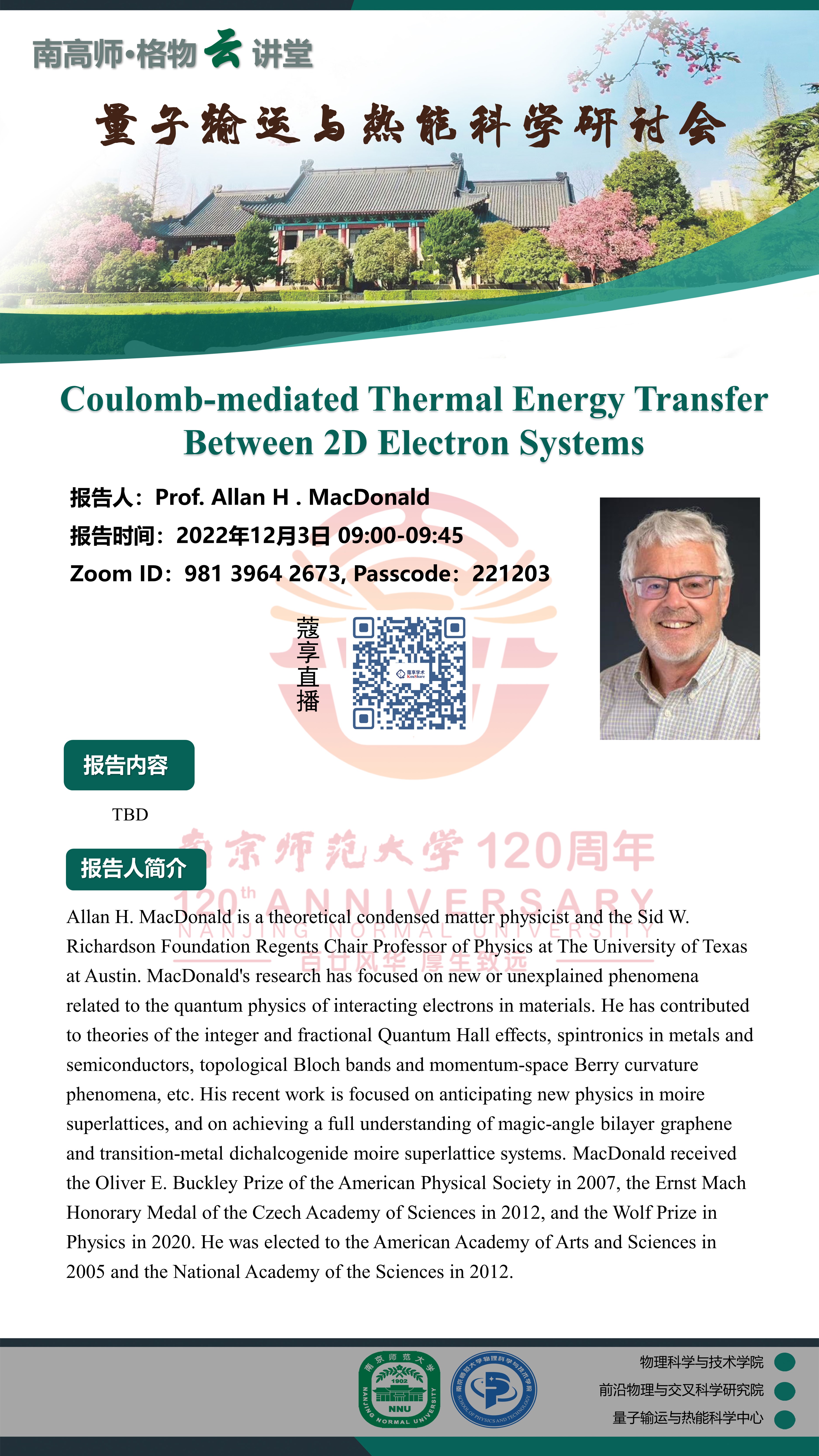 【学术预告】“南高师·格物云讲堂” Coulomb-mediated Thermal Energy Transfer Between 2D Electron Systems—Prof. Allan H .MacDonald
