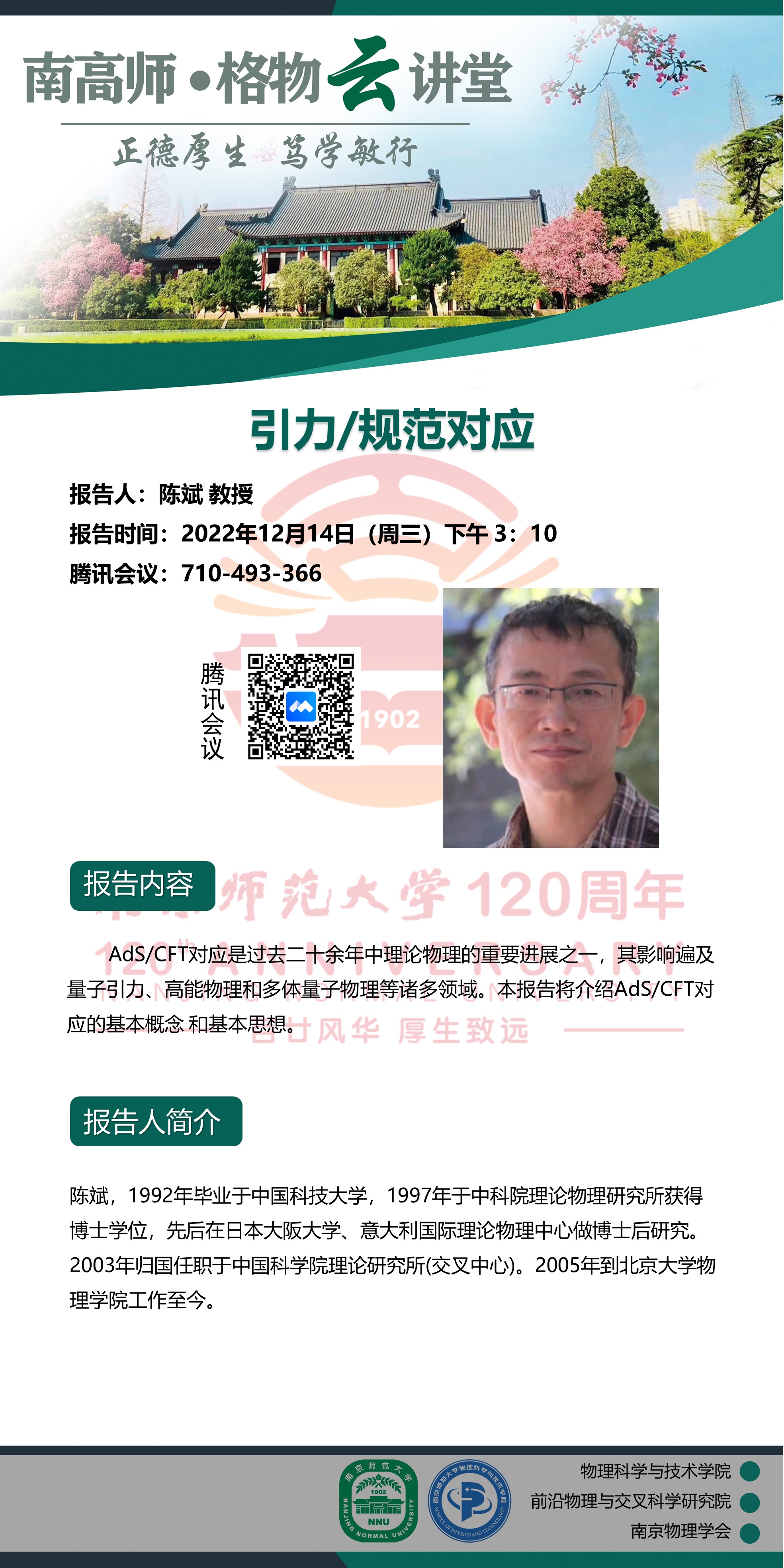 【学术预告】“南高师·格物云讲堂” 引力规范对应—陈斌教授师·格物云讲堂” 引力规范对应—陈斌教授