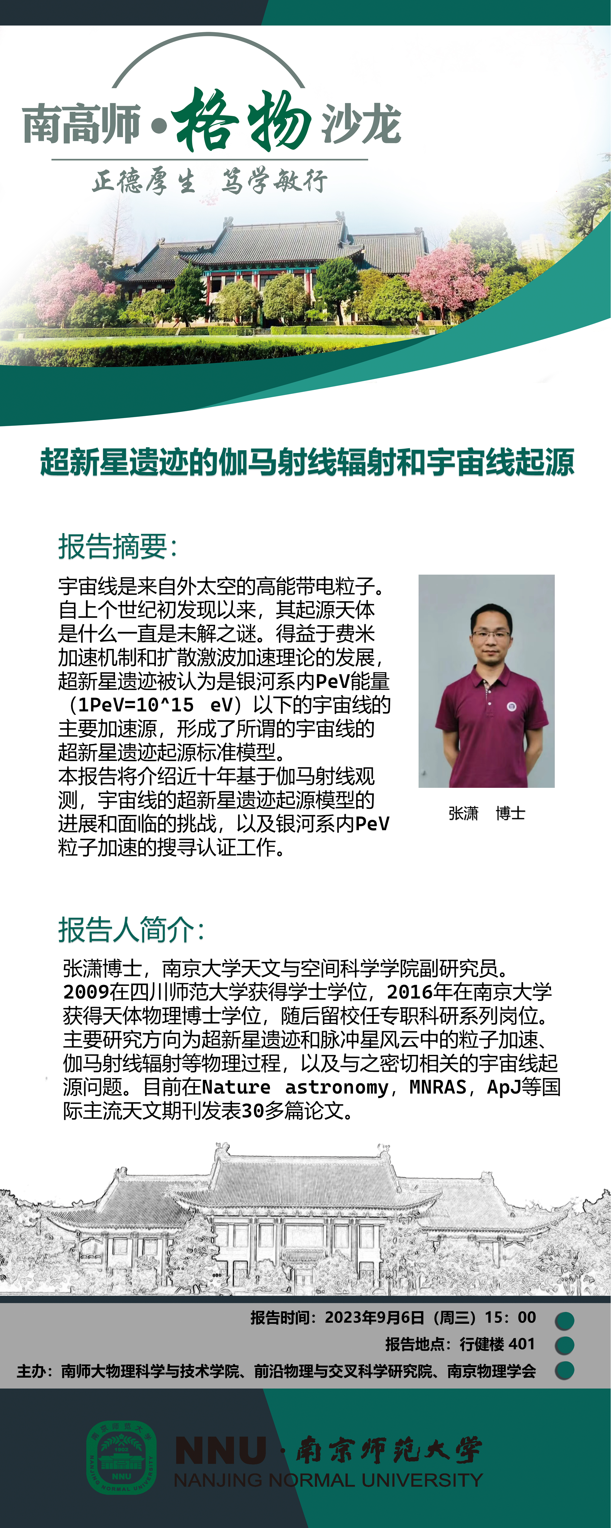 【学术预告】“南高师·格物沙龙” 超新星遗迹的伽马射线辐射和宇宙线起源--张潇博士