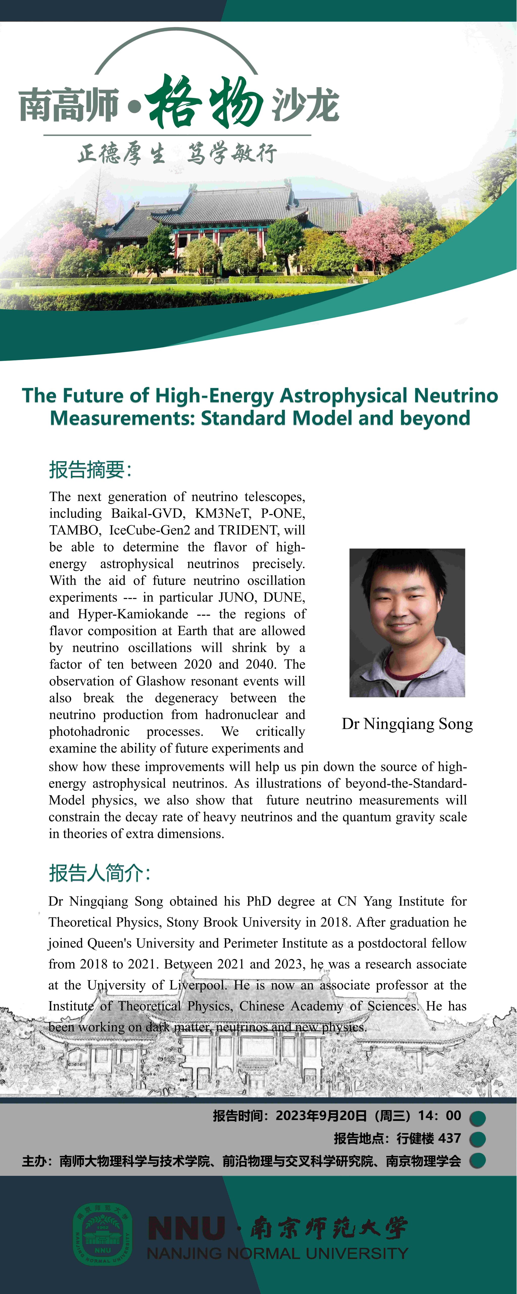 【学术预告】“南高师·格物沙龙” The Future of High-Energy Astrophysical Neutrino Measurements: Standard Model and beyond--Dr Ningqiang Song