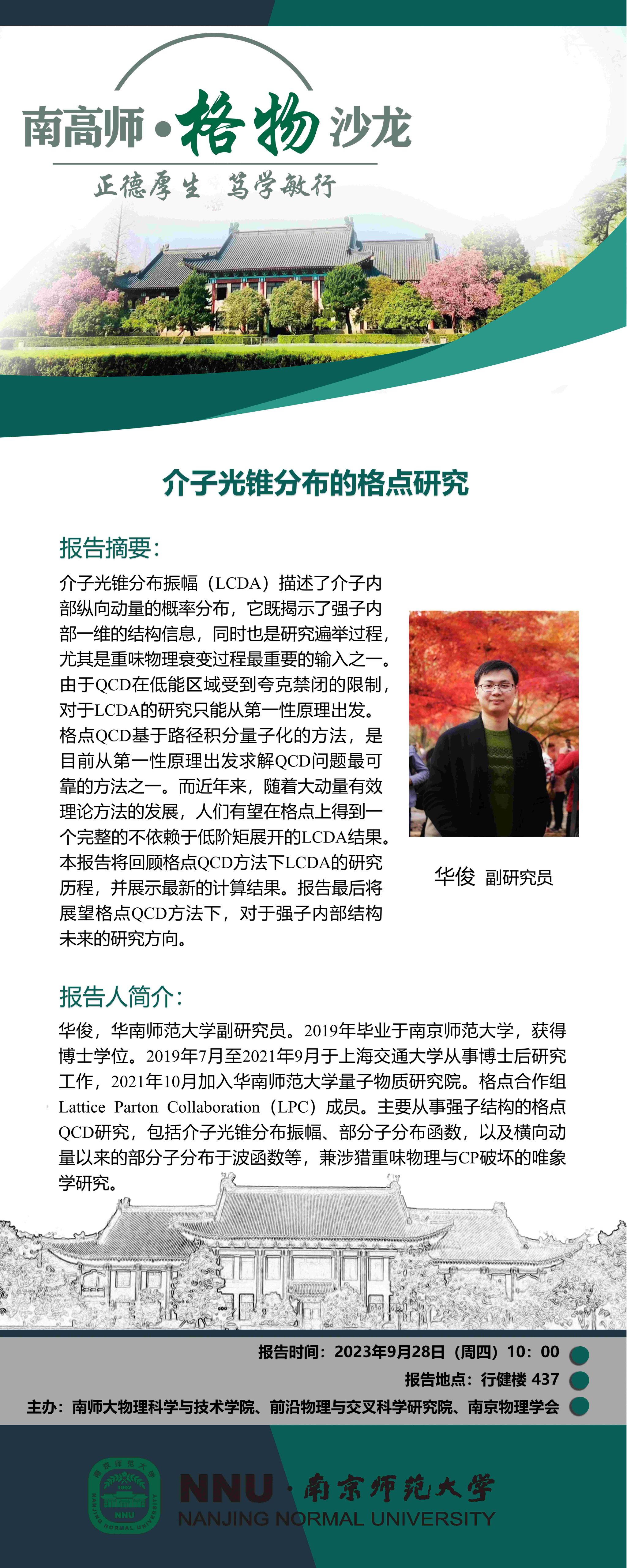 【学术预告】“南高师·格物沙龙” 介子光锥分布的格点研究--华俊副研究员