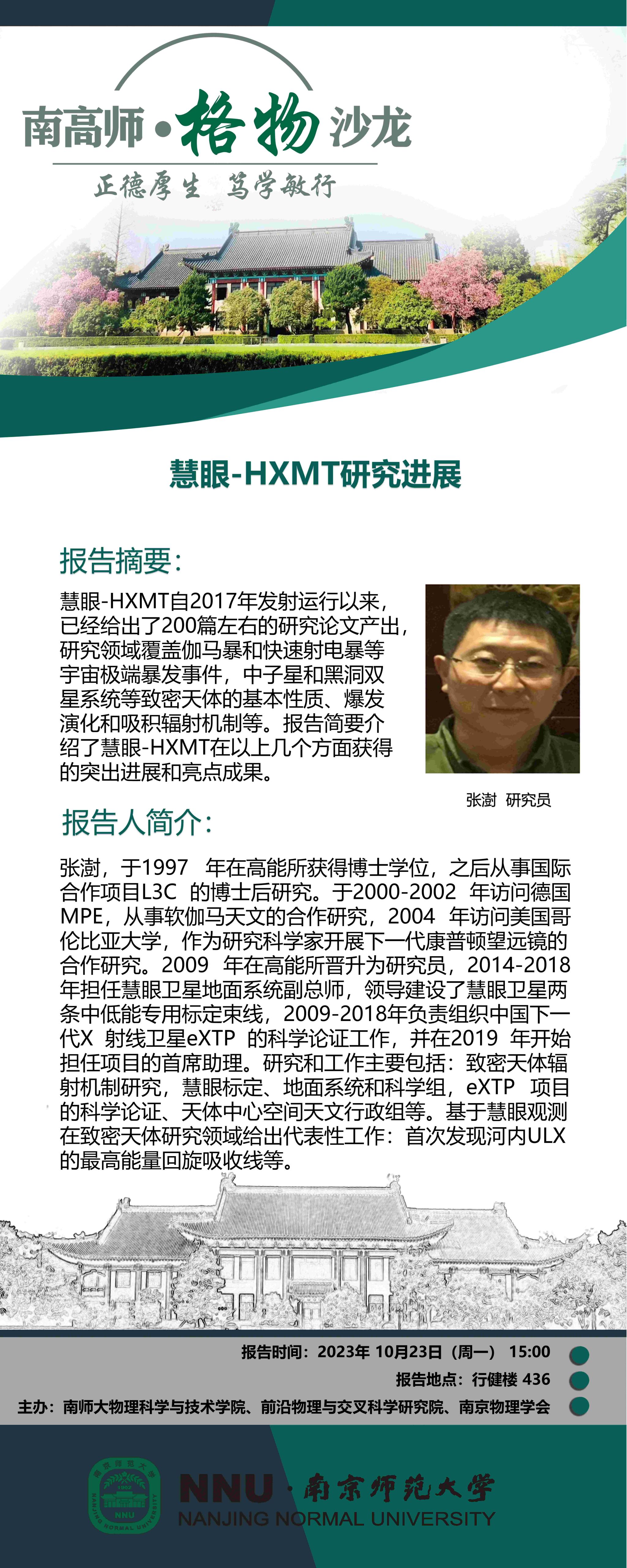 【学术预告】“南高师·格物沙龙” 慧眼-HXMT研究进展--张澍研究员