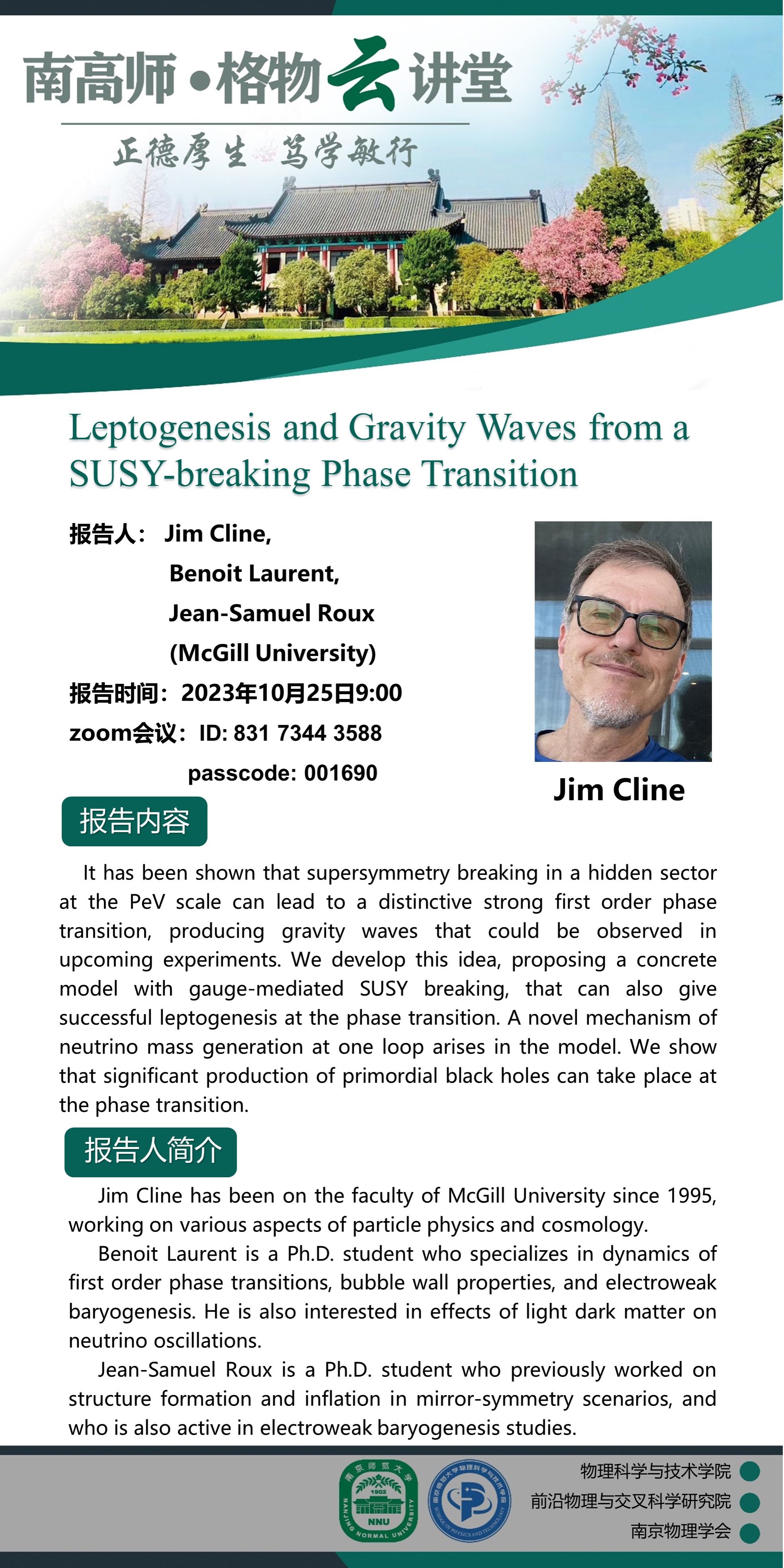 【学术预告】“南高师·格物云讲堂” Leptogenesis and Gravity Waves from a SUSY-breaking Phase Transition--Prof. Jim Cline