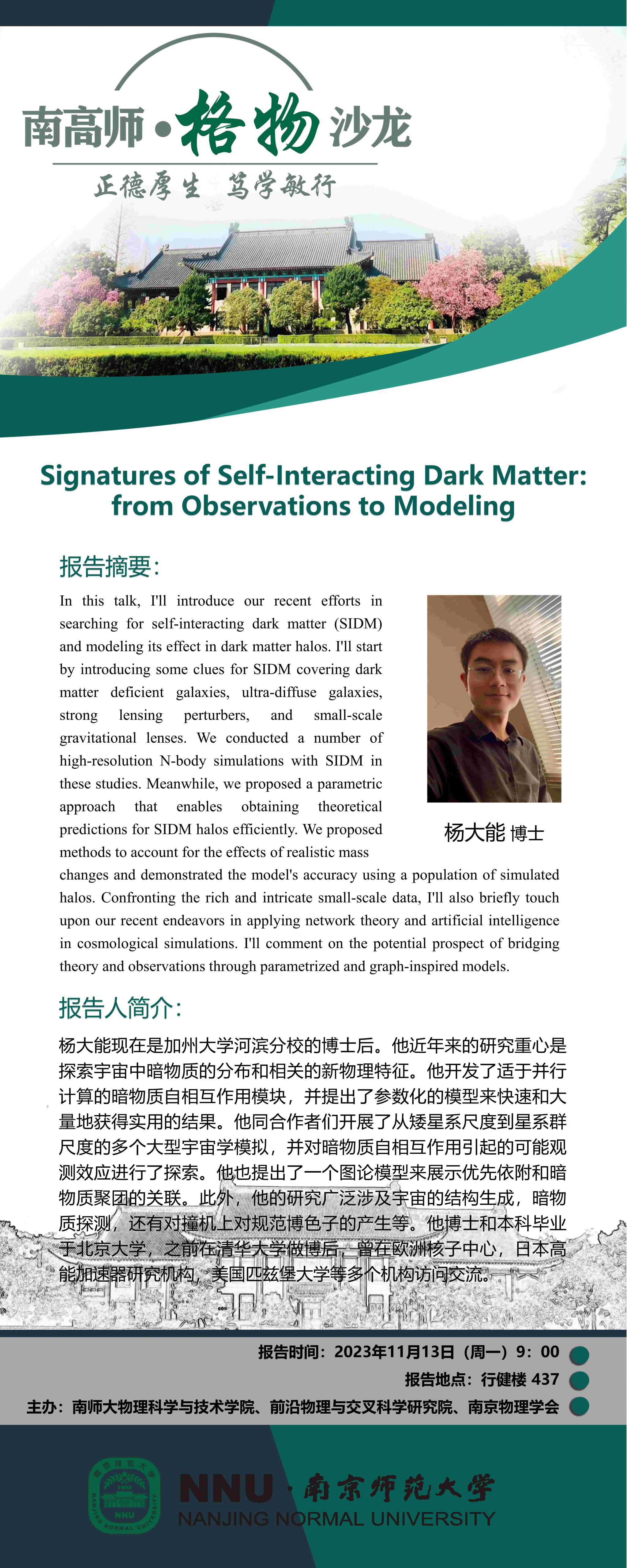 【学术预告】“南高师·格物沙龙” Signatures of Self-Interacting Dark Matter:from Observations to Modeling--杨大能博士
