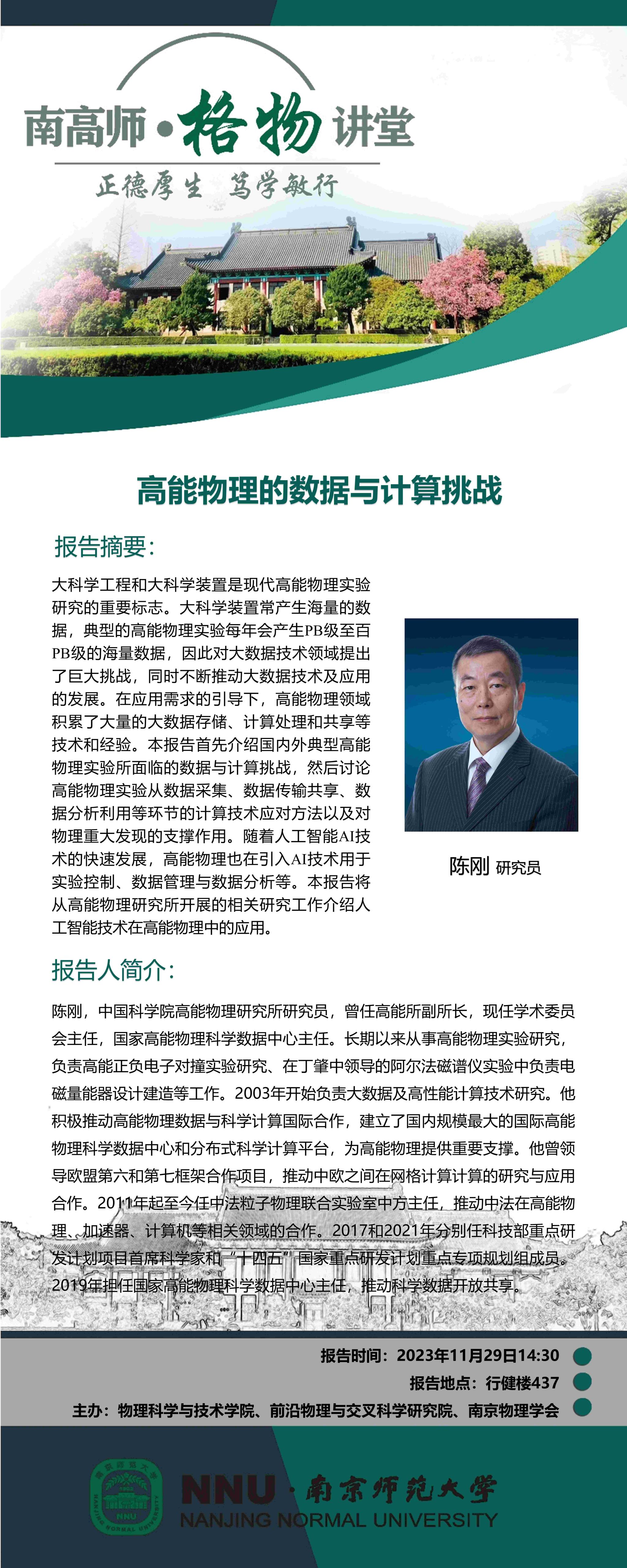 【学术预告】“南高师·格物讲堂”高能物理的数据与计算挑战--陈刚研究员
