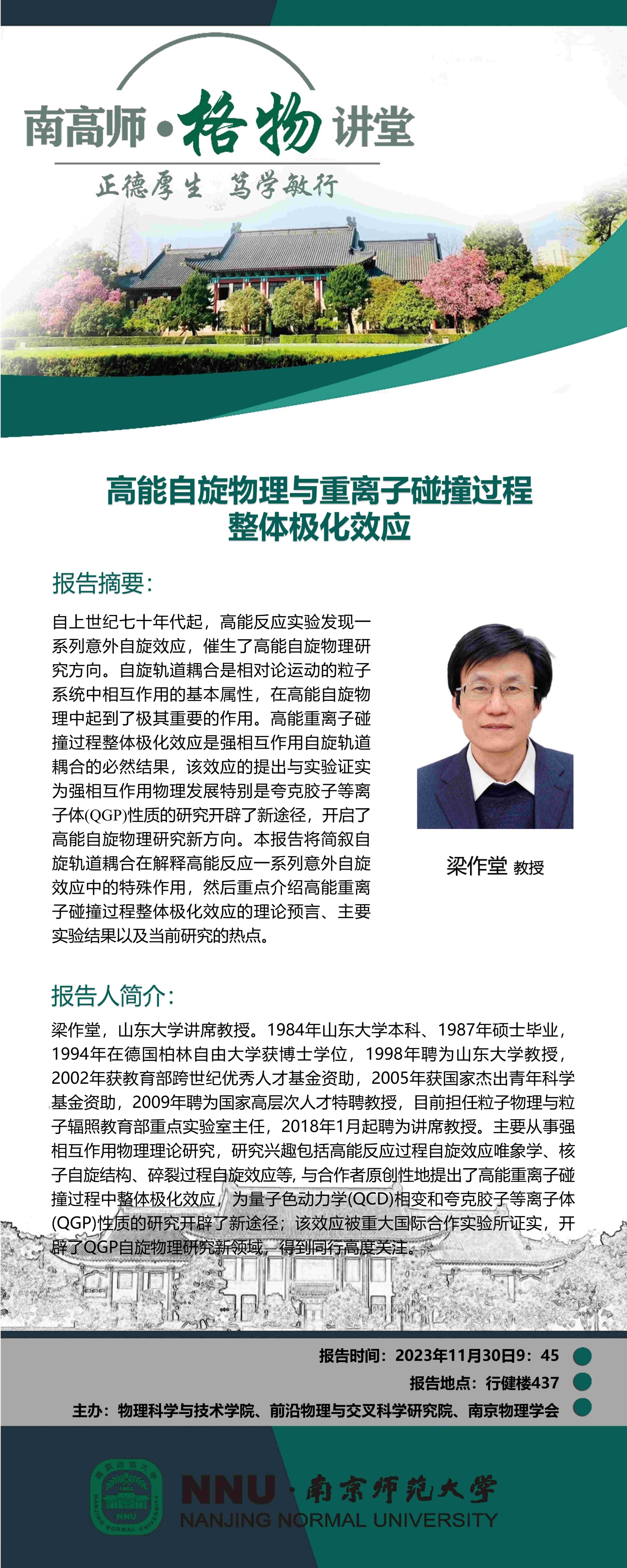 【学术预告】“南高师·格物讲堂”高能自旋物理与重离子碰撞过程整体极化效应--梁作堂教授