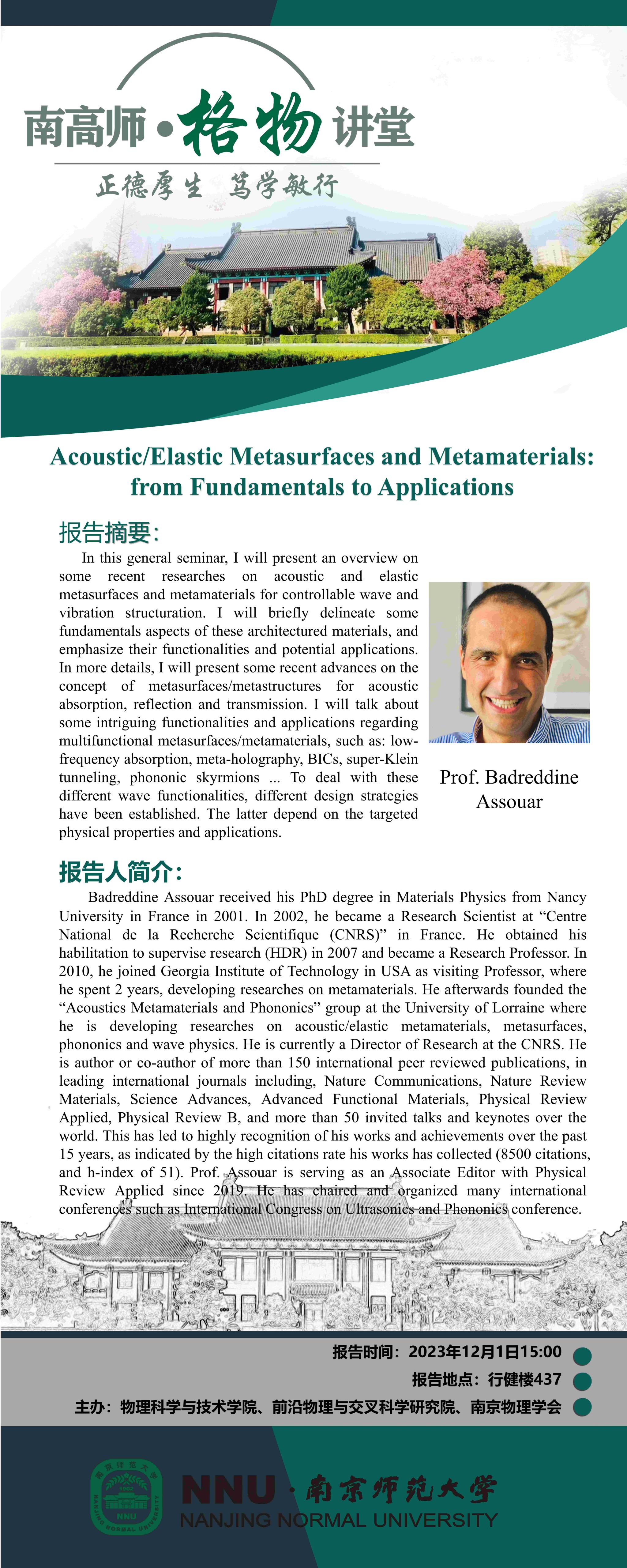 【学术预告】“南高师·格物讲堂” Acoustic/Elastic Metasurfaces and Metamaterials: from Fundamentals to Applications--Prof. Badreddine Assouar