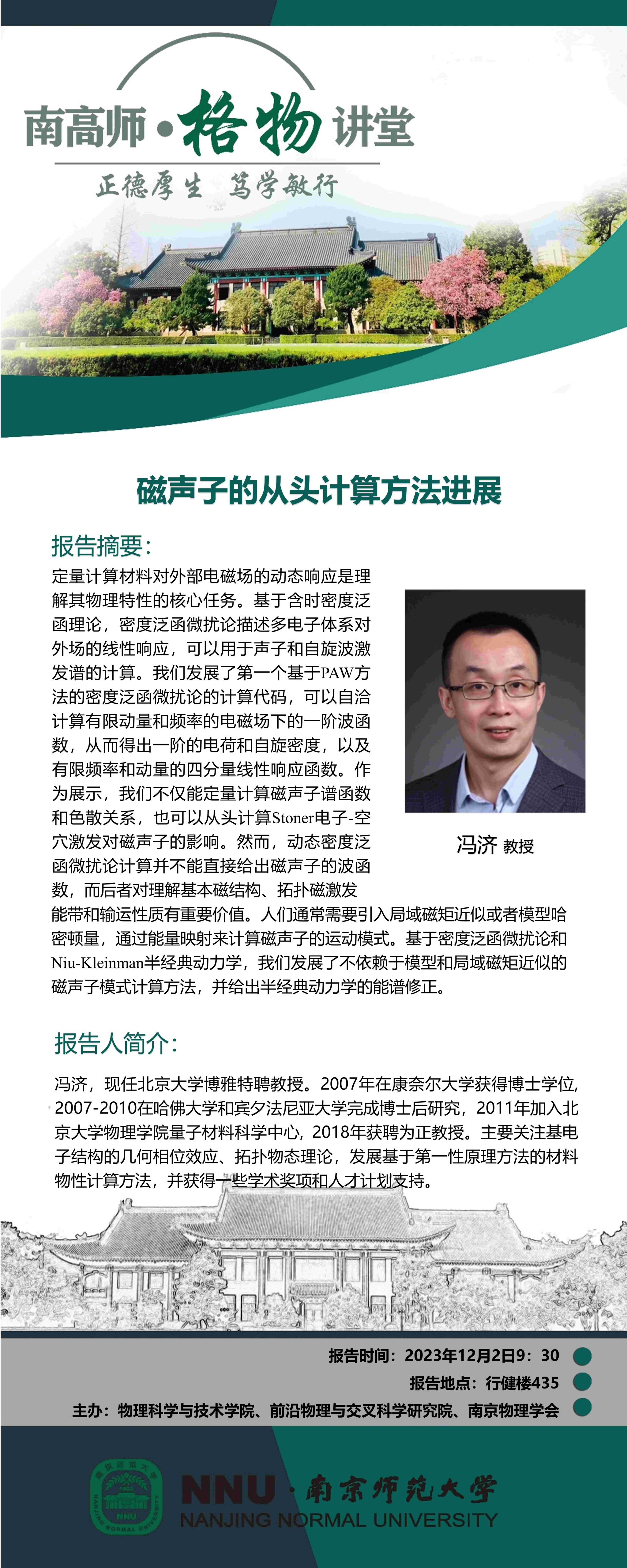 【学术预告】“南高师·格物讲堂”磁声子的从头计算方法进展--冯济教授