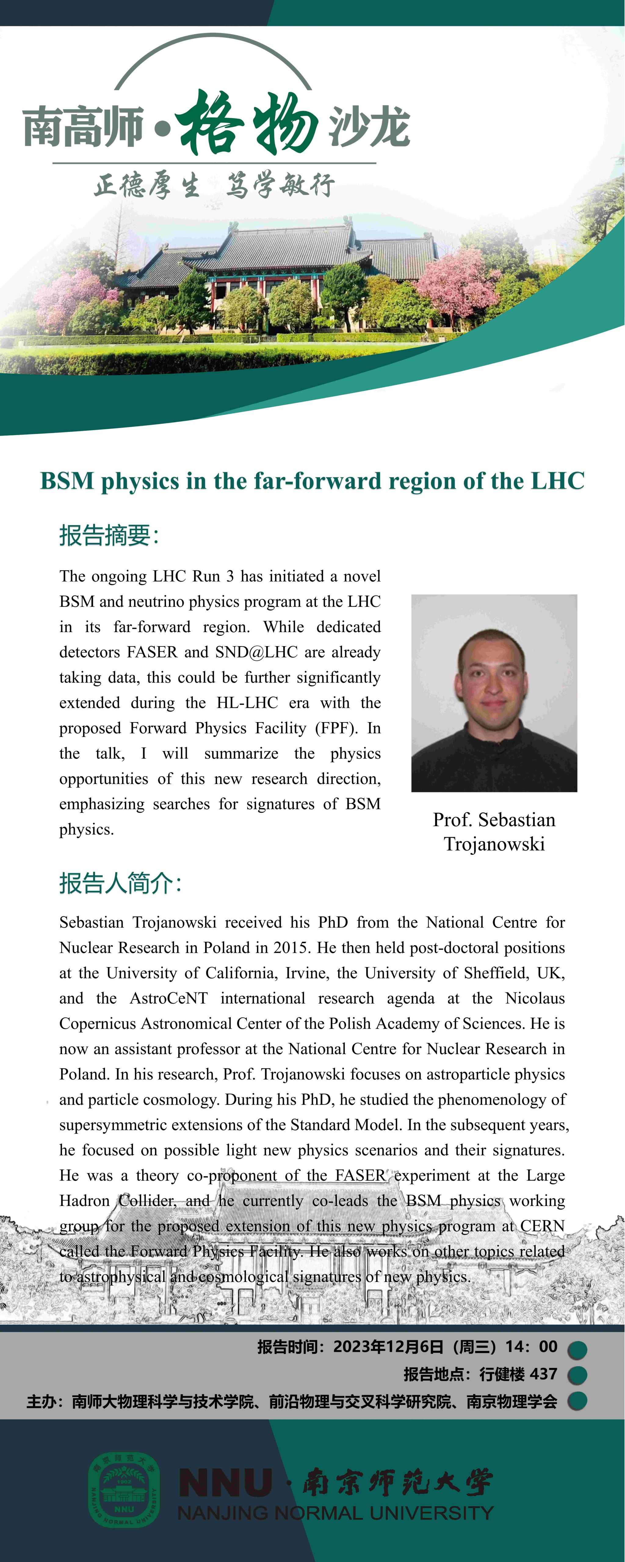【学术预告】“南高师·格物沙龙” BSM physics in the far-forward region of the LHC--Prof. Sebastian Trojanowski