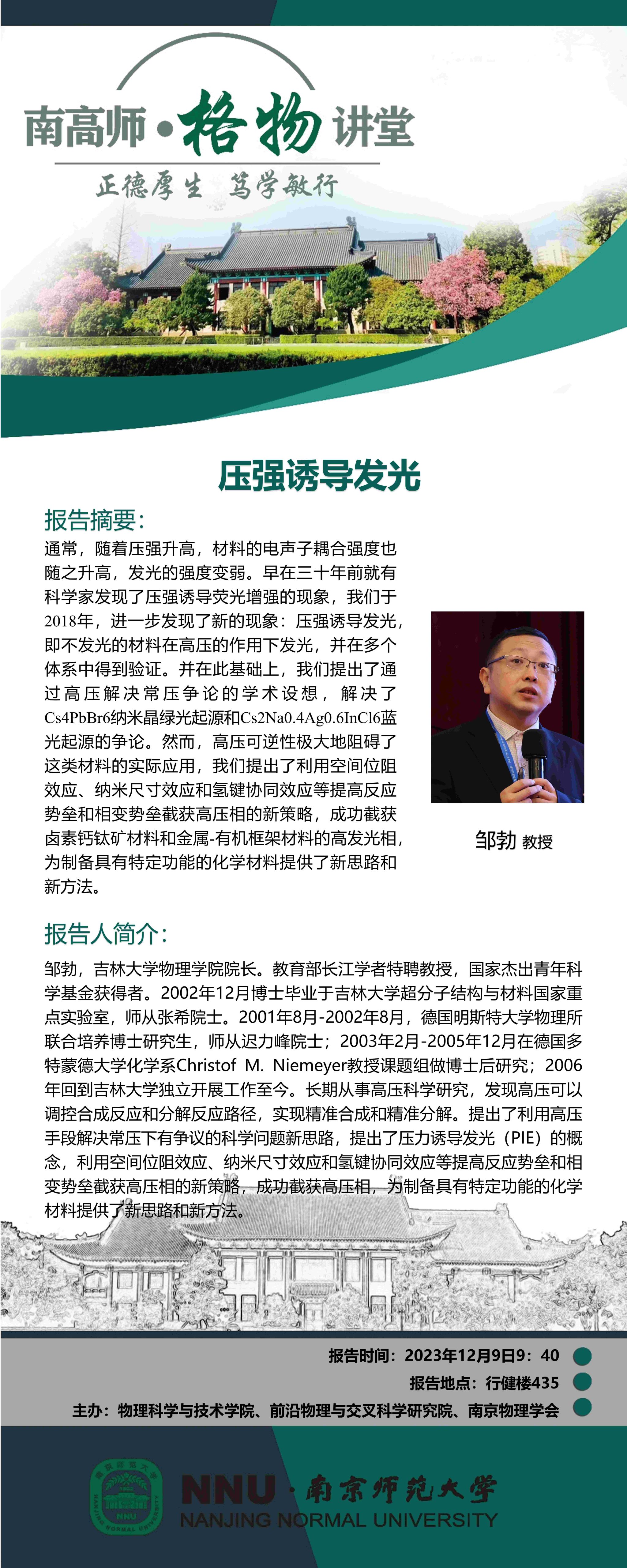 【学术预告】“南高师·格物讲堂”压强诱导发光--邹勃教授