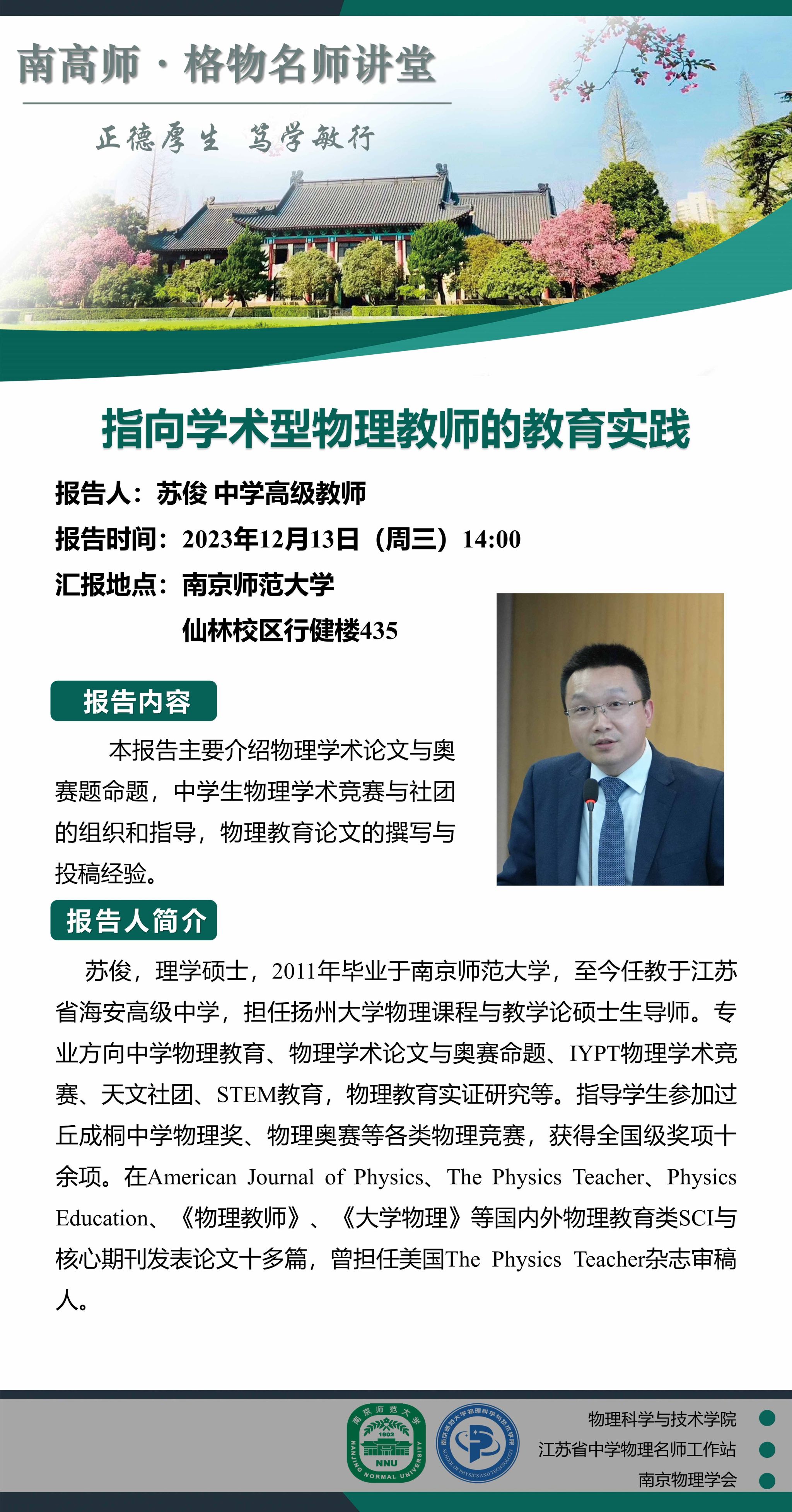 【学术预告】“南高师·格物名师讲堂”指向学术型物理教师的教育实践--苏俊中学高级教师