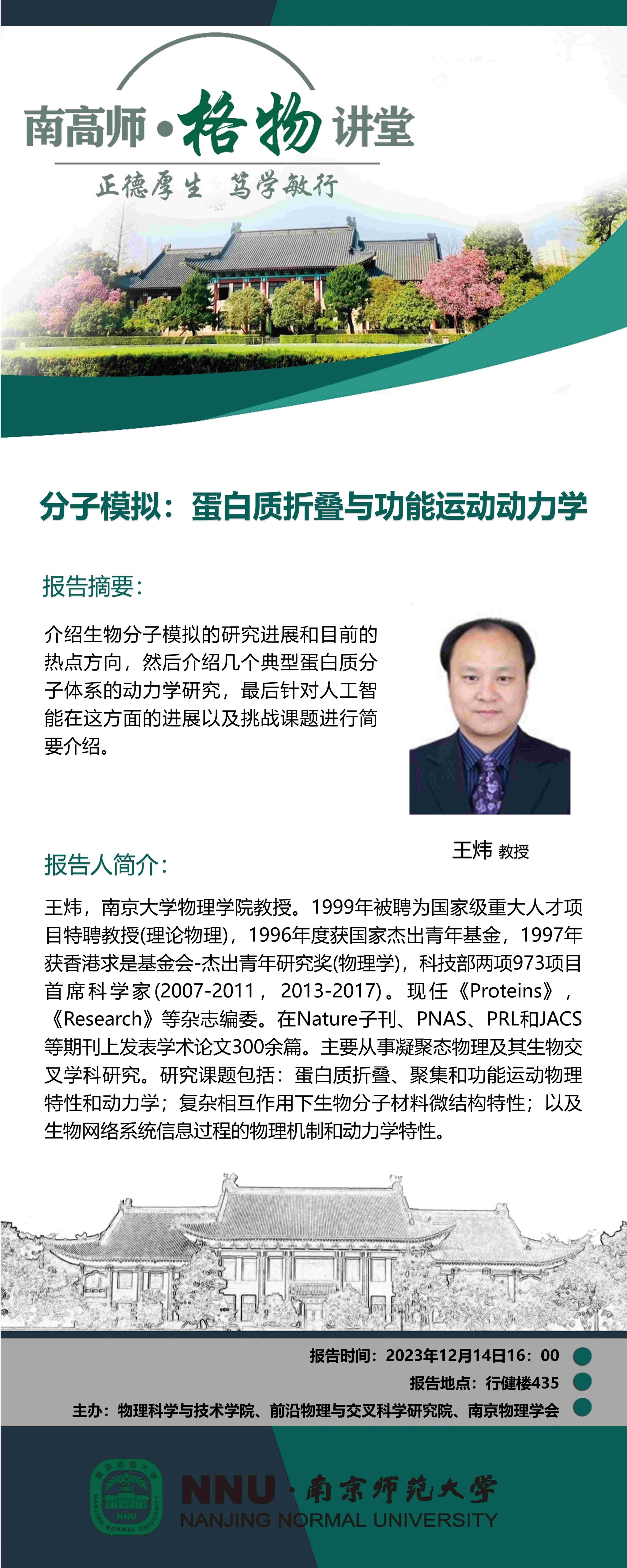 【学术预告】“南高师·格物讲堂”分子模拟:蛋白质折叠与功能运动动力学--王炜教授