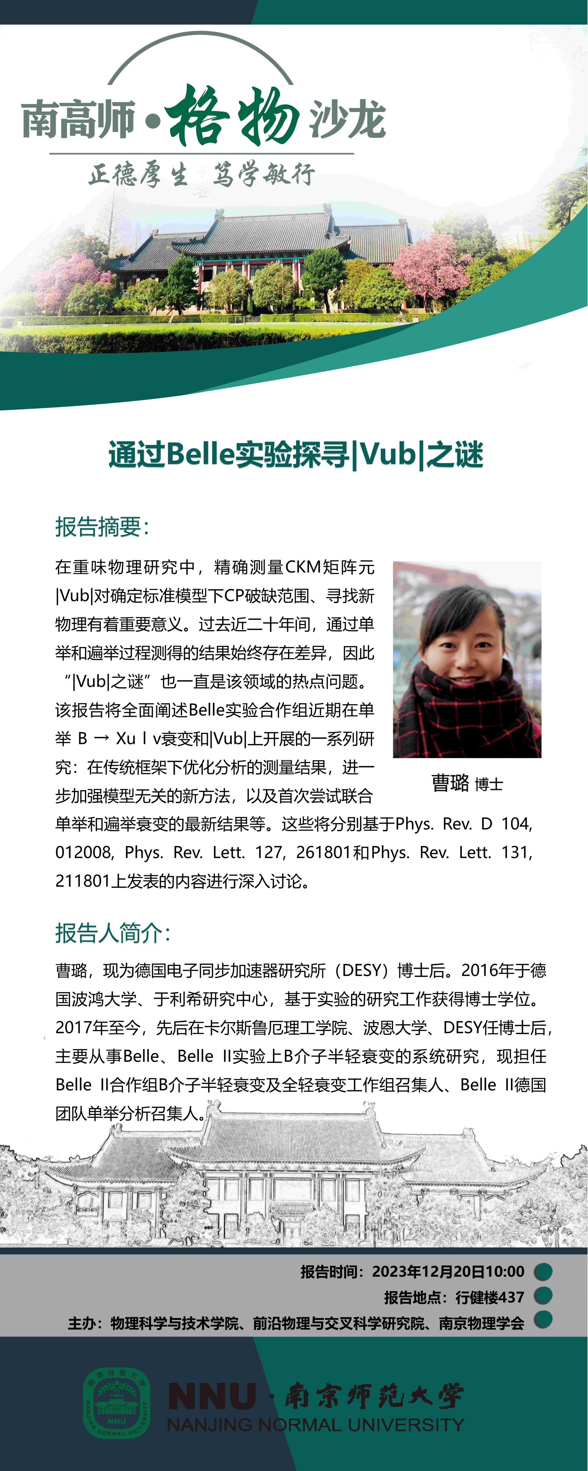 【学术预告】“南高师·格物沙龙” 通过Belle实验探寻|Vub|之谜--曹璐博士