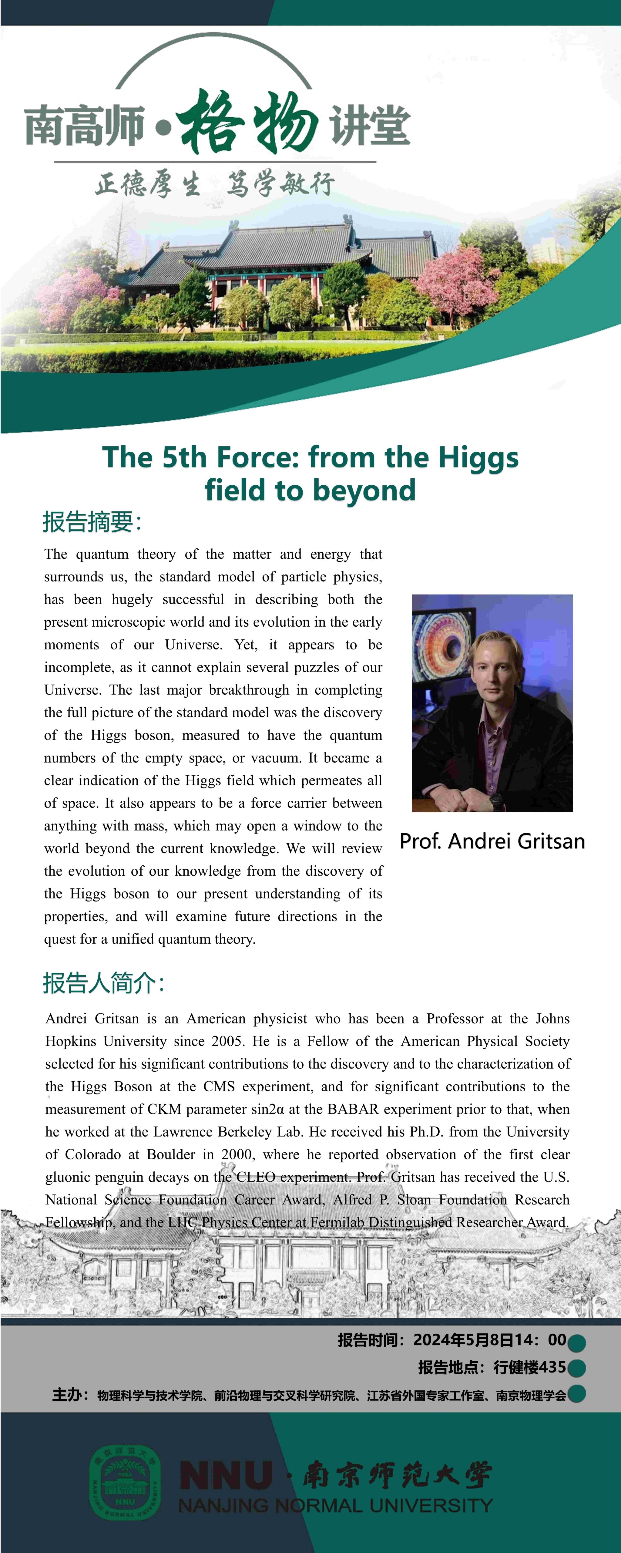 【学术预告】“南高师·格物讲堂” The 5th Force: from the Higgs field to beyond--Prof. Andrei Gritsan