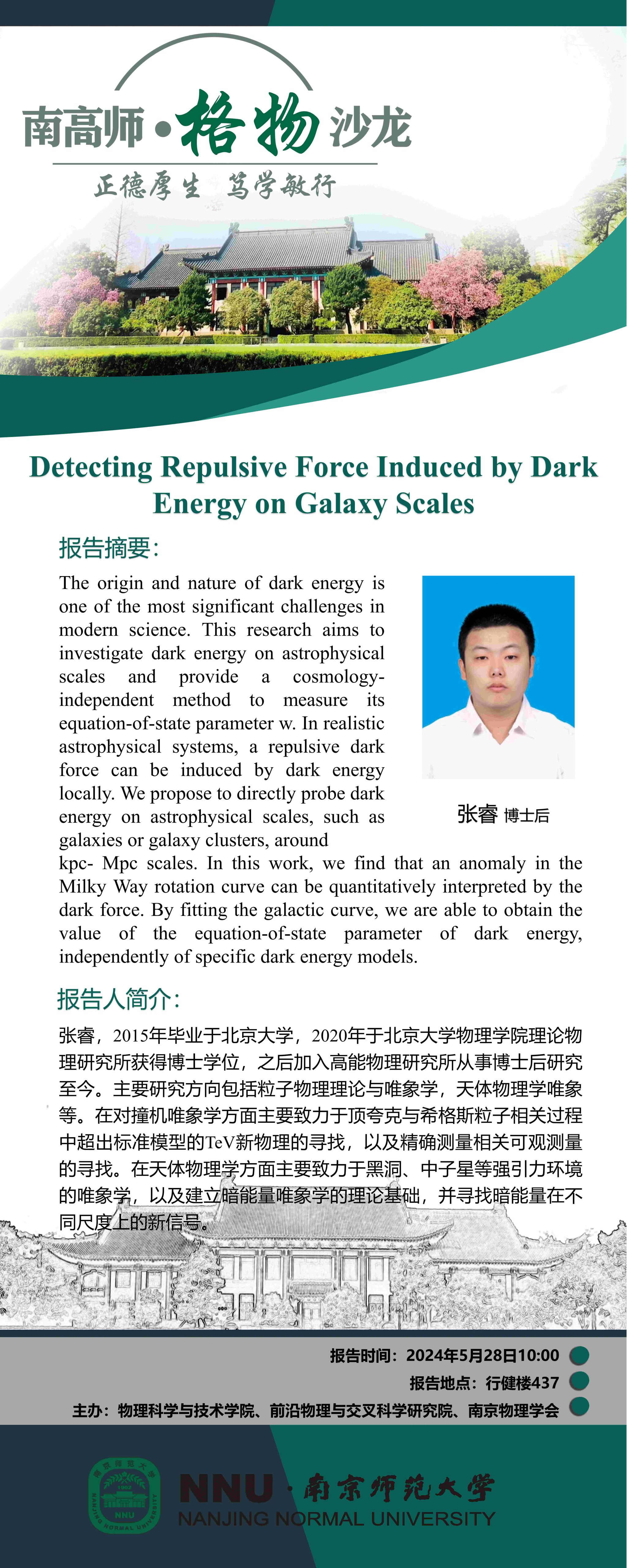 【学术预告】“南高师·格物沙龙” Detecting Repulsive Force Induced by Dark Energy on Galaxy Scales--张睿博士后