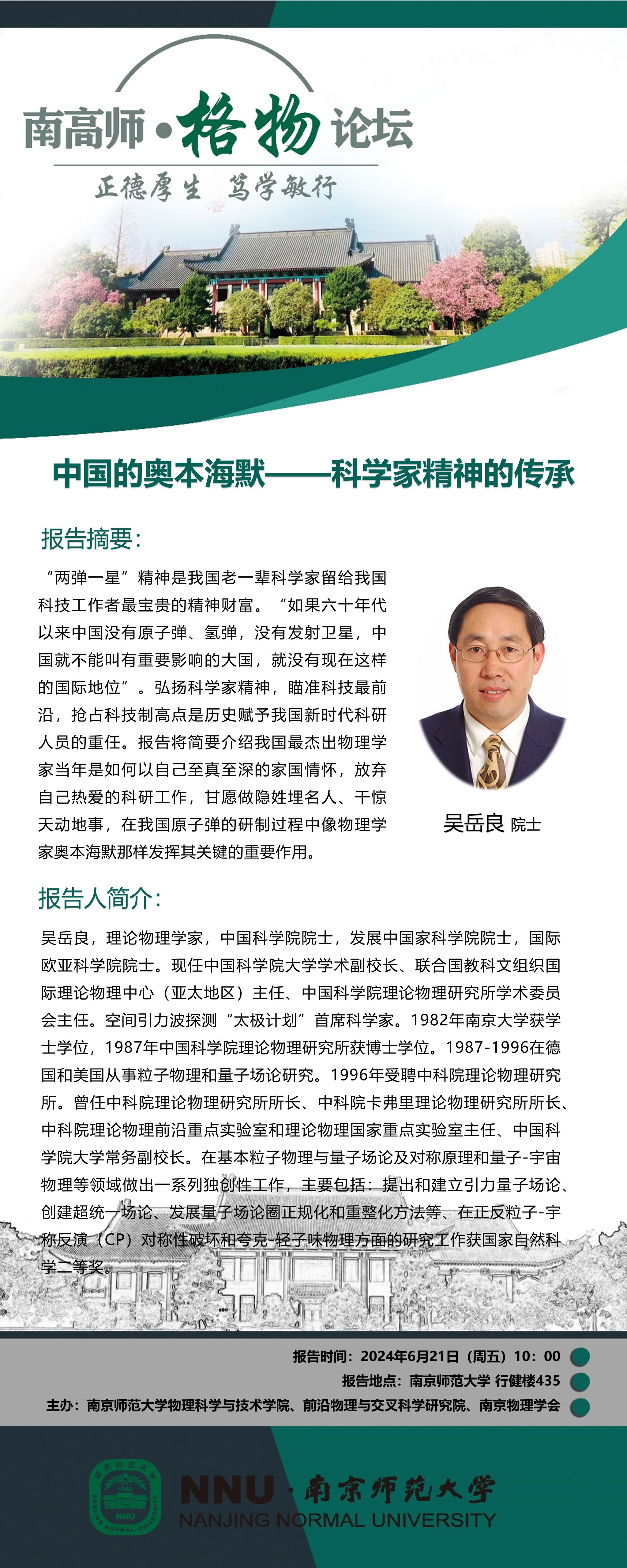 【学术预告】“南高师·格物论坛” 中国的奥本海默——科学家精神的传承--吴岳良院士