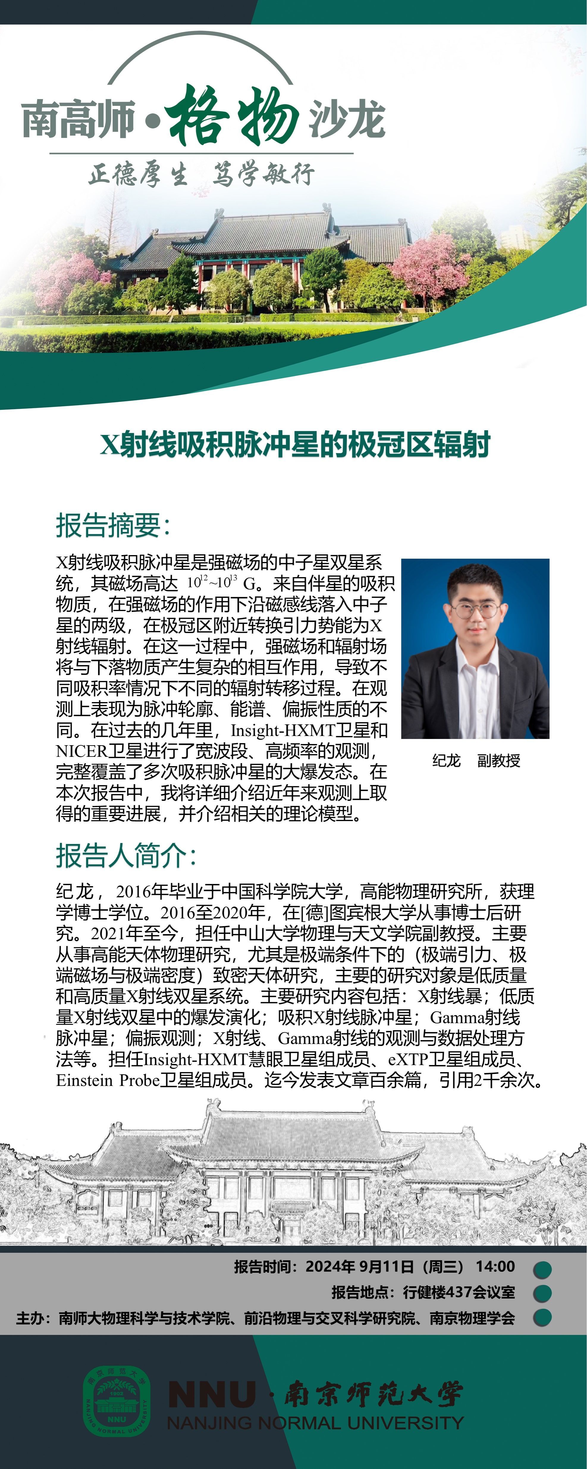 【学术预告】“南高师·格物沙龙” X射线吸积脉冲星的极冠区辐射