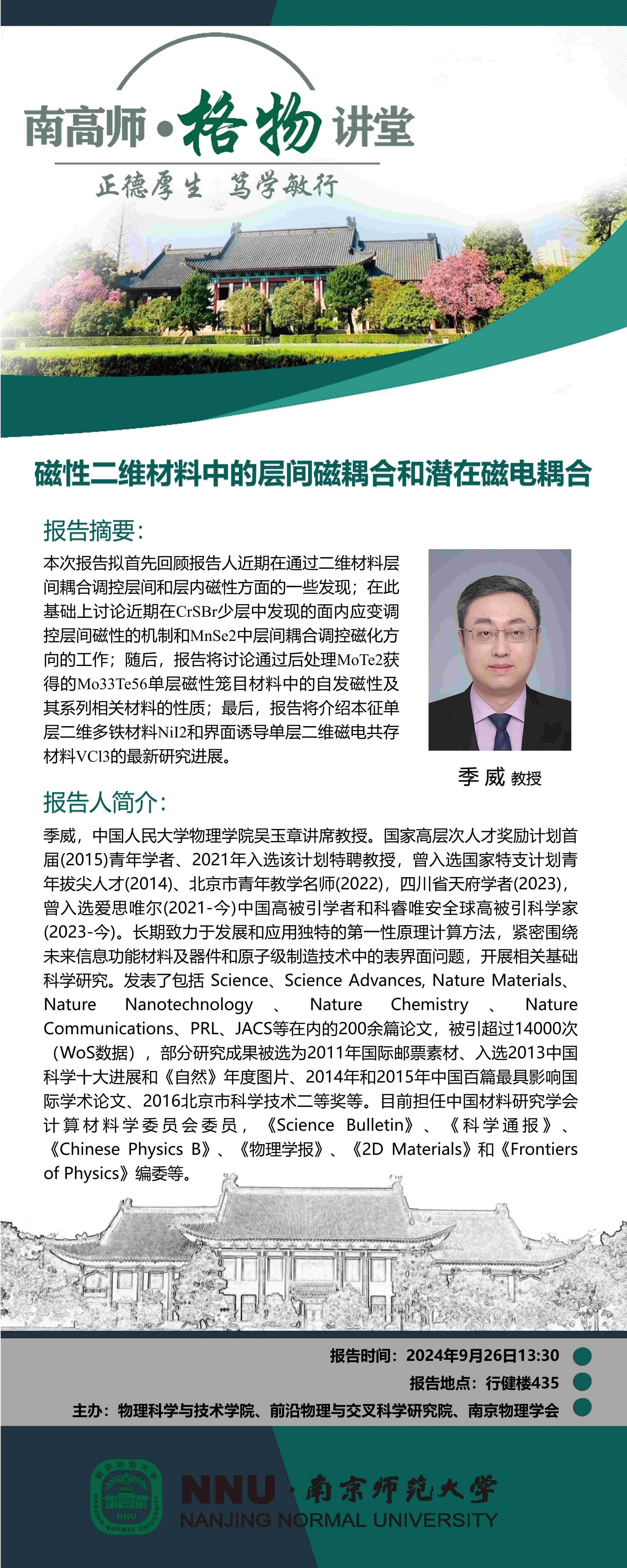 【学术预告】“南高师·格物讲堂” 磁性二维材料中的层间磁耦合和潜在磁电耦合--季威教授