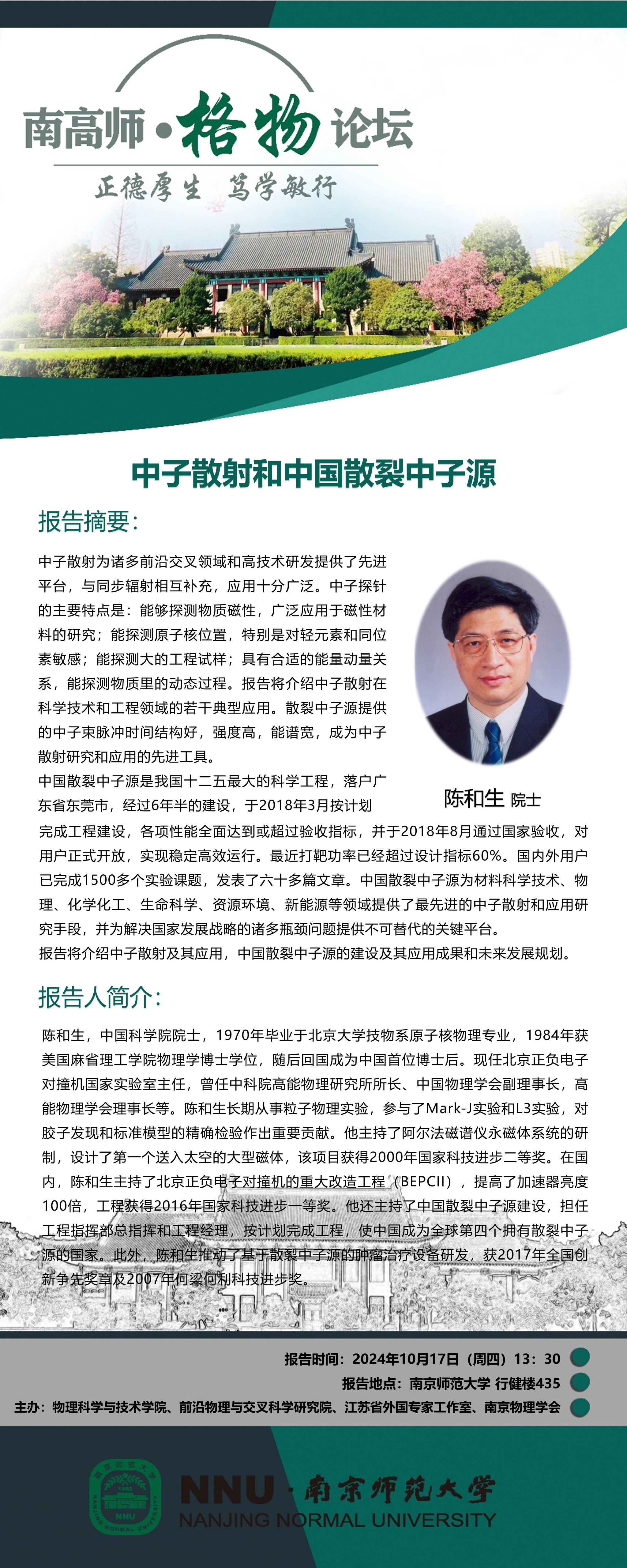 【学术预告】“南高师·格物论坛” 中子散射和中国散裂中子源--陈和生院士