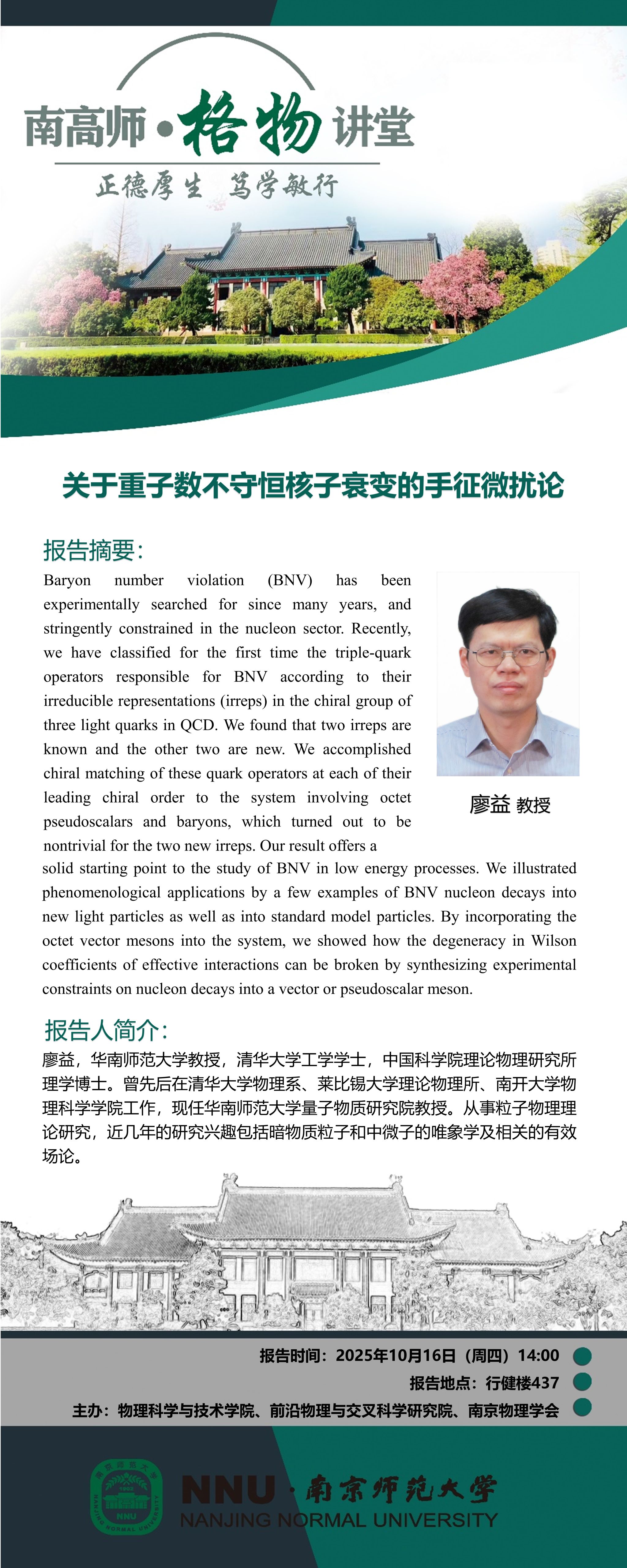 上一条:【学术预告】“南高师·格物沙龙” 轻味混杂态介子--陈伟教授 下一条:【学术预告】“南高师·格物沙龙” The unified study of Tcc and X(3872) from model, experimental data and Lattice data--吴佳俊副教授