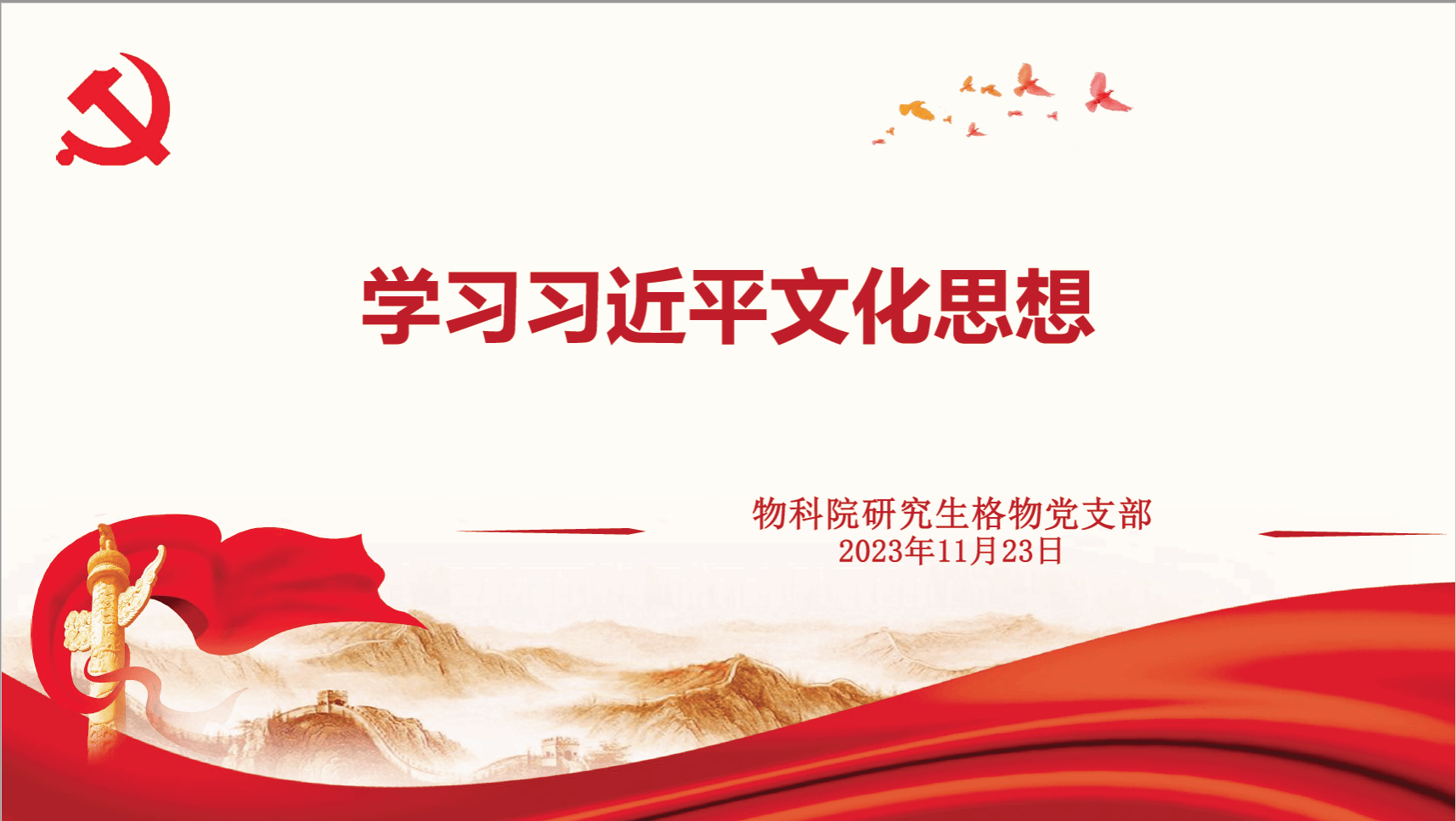 全国宣传思想文化工作会议首次提出“习近平文化思想”是在继承发展党成立以来领导文化建设探索成果和宝贵经验的基础上,在新时代文化建设的伟大实践中形成并不断丰富发展的,是新时代党领导文化建设实践经验的理论总结。近日,物科院学生党支部以“深入学习贯彻习近平文化思想”为主题开展党日活动。