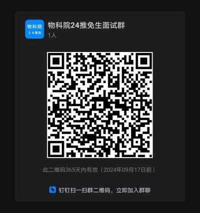 将多批次组织复试,请拟报名参加推免面试的同学尽快登录我校推免生申请系统进行预报名,并扫码进入物科院硕士推免钉钉群,群内实时公布各类通知。