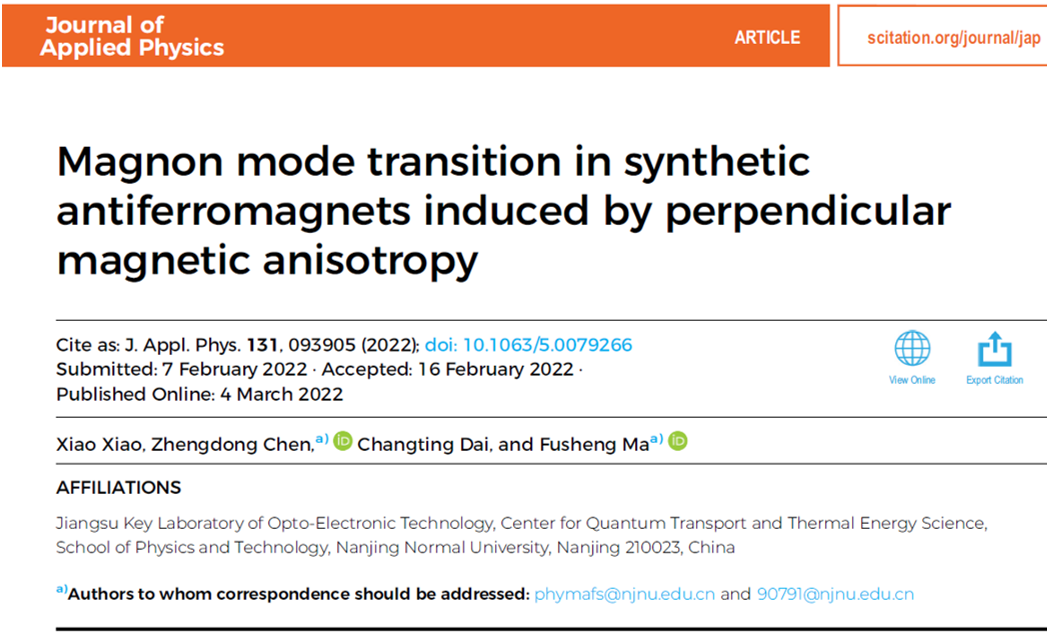 马付胜教授团队2018级本科生肖晓以第一作者身份在国际知名期刊J. Appl. Phys.上发表题为“Magnon mode transition in synthetic antiferromagnets induced by perpendicular magnetic anisotropy”论文。J. Appl. Phys.是美国物理联合会旗下的知名期刊。