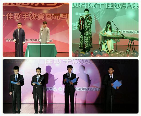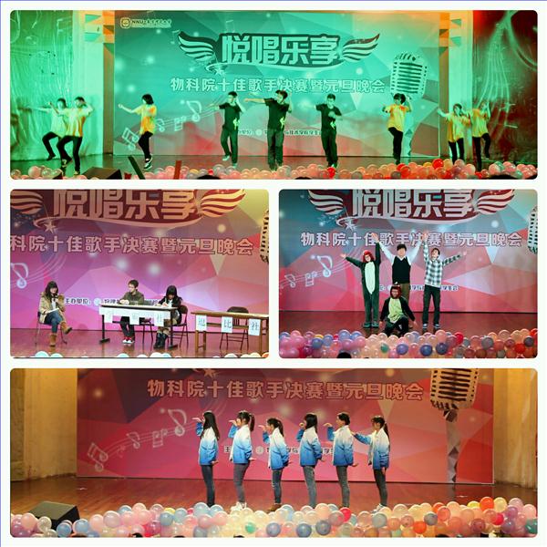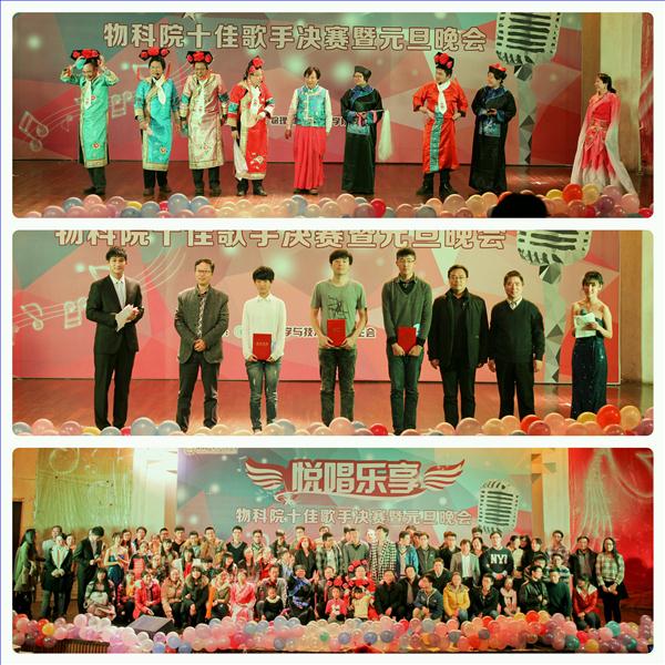 2014年12月29日晚,物科院“悦唱乐享十佳歌手”决赛暨元旦晚会在J6音乐厅隆重举行。学院党委书记周海忠、院长聂守平、党委副书记周娅、副院长叶静、副院长郭立波、副院长马青玉、副院长朱竹青莅临本次晚会,并担任评委为此次参赛选手打分,学院部分老师也来到现场,与现场的同学们一起度过了一个难忘的夜晚。
