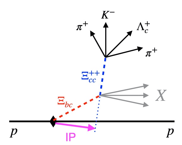 在过去的几年中,LHC已经多次尝试寻找Ξbc,但一直未有所获。朱瑞林与合作者发现通过遍举衰变来寻找新粒子的传统方案对于Ξbc存在着很大困难。因为Ξbc包含一个b夸克,它衰变到任何一个特定遍举末态的概率都极低,这造成遍举方案的重建效率极低。为了克服此困难,朱瑞林与华中科大等高校专家合作,创新性地提出利用单举衰变来寻找Ξbc。该单举方案涉及的具体衰变过程是Ξbc衰变到Ξcc以及其他所有可能的粒子Ξbc→ Ξcc+X,如图2所示,此过程最有利的特征是Ξbc产生后在探测器中将飞行一段距离再进行衰变,这样就形成一个偏离主对撞顶点的Ξcc,而Ξbc是此现象的唯一主要来源。因此,搜寻到偏离主对撞顶点的Ξcc,便发现了Ξbc重子。这与天文观测中通过天王星摄动发现海王星有异曲同工之妙。