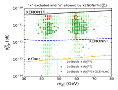 图1:左为满足Muon g-2和FermiLat银心伽马射线兆电子伏超出的参数空间(红色点),满足AMS-02反质子超出的参数空间(蓝色阴影区域);右为暗物质与核子自旋无关的散射截面,其中黑色实线和蓝色虚线分别是Xenon1T和XenonnT实验90%置信水平排除线(图取自Abdughani et al. 2021 Sci. Bull.)