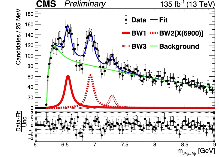 基于2016~2018年采集的所有“质子-质子”对撞数据,CMS合作组在两个粲夸克偶素(J/ψ,夸克成分为粲夸克c和反粲夸克c ̅)的不变质量谱中观测到了一个新的粒子家族,其中的每一个粒子可能由四个同味重夸克(ccc ̅c ̅)组成,这种由四个夸克组成的四夸克态被称为奇特强子,有别于由两个或者三个夸克组成的传统强子。该家族中的三个共振峰依据质量被暂时命名为X(6600)(显著度超过5个标准差)、X(6900)(显著度超过5个标准差)和X(7300)(显著度4.1倍标准差)。X(6600)和X(7300)粒子均是在世界上首次被观测到;X(6900)粒子存在的证据已在两年前被LHCb实验观测到,CMS的结果确认了X(6900)的存在。该研究成果将以《在13 TeV质子质子对撞产生的J/ψJ/ψ质量谱上观测到的新结构》(Observation of new structures in the J/ψJ/ψ mass spectrum in pp collisions at √s = 13 TeV)为题于近期投稿。