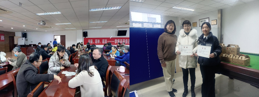 分工会采用电脑抽签的方式对参赛队伍进行分组,然后采用了计时和计轮相结合定胜负的赛制。参赛老师们在进行牌技切磋的时候,彼此配合默契,相互斗智斗勇,充分施展竟技水平。参赛选手秉承“友谊第一,比赛第二”的原则,以牌为媒,以赛为形,相互沟通,增进了解。比赛现场热闹融洽,选手们时而紧张沉思,时而互相调侃,欢声笑语不绝。经过五轮激烈的角逐,最终黄虹霞老师和高桂芳老师赢得冠军,俞之舟和魏琦两位老师获得亚军。开云书记为获奖老师颁奖。