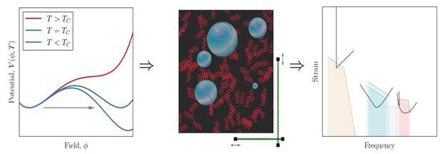 一阶相变产生的引力波携带着早期宇宙物理学的信息。随着宇宙的冷却和膨胀,扮演自由能角色的标量势的形状会发生变化。在特定的温度下,可能会出现一个新的真空,与现有的真空隔开,如上图所示。向新真空的过渡将通过膨胀的气泡进行,气泡通过与热等离子体的摩擦和碰撞产生引力波,直到它们主宰宇宙。在不久的将来,可以使用激光干涉仪检测引力波信号。该综述重点从粒子物理微扰论方法出发,结合格点模拟的方法,总结了实验、唯象和理论方面的进展,详细分析了产生相变引力波的五个重要阶段: