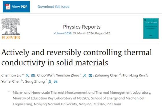 能源与机械工程学院刘晨晗教授、新加坡高性能计算中心张刚教授合作在国际权威综述期刊《Physics Reports》 (2023年影响因子30,中科院一区TOP期刊) 上发表了题为“Actively and reversibly controlling thermal conductivity in solid materials”的长篇综述文章【Physics Reports 1058, 1-32 (2024)】。《Physics Reports》是物理学和交叉科学类最具影响力的国际综述性期刊之一,专门发表该领域各研究方向全球知名专家撰写的综述性论文,对相关领域的发展具有重要的引领和指导作用。该刊每期只发表一篇论文,全部由杂志编辑邀约在相关领域做出突出贡献的专家学者撰稿。本文的第一作者是博彩论坛