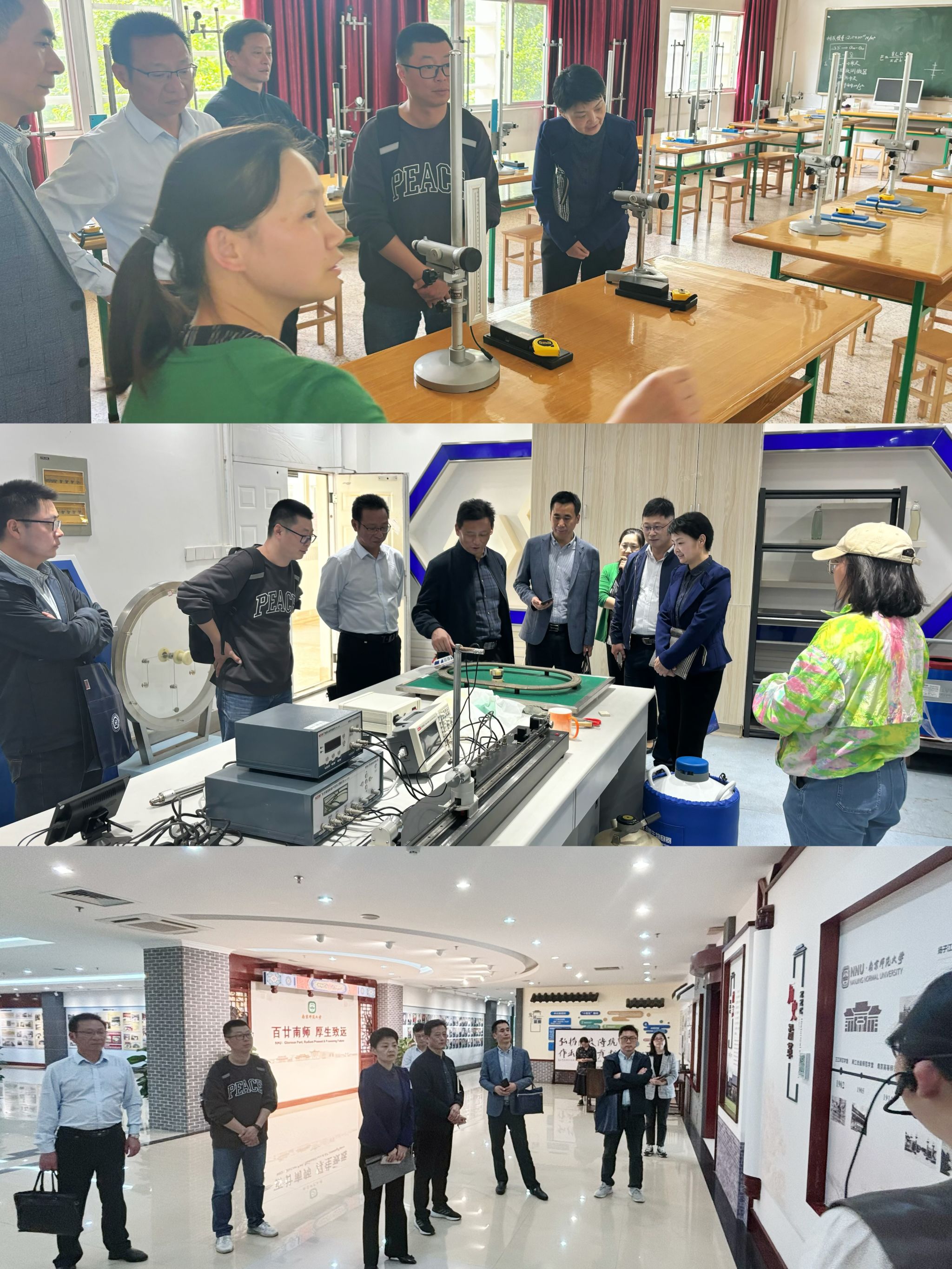 在合作交流会正式开始前,马鞍山市花山区教育局局长华俊一行8人,前往物科院大学物理实验中心和江苏省科普基地——物理演示实验室进行了参观,在物科院大学物理实验中心主任褚红燕老师和张嫣老师的介绍下,参观了解实验中心相关仪器、设备及开设各类实验课程的情况。随后,他们一行前往南师大校史馆,在大学生志愿者的讲解下,通过珍贵的历史资料和实物展示,深入了解南师大悠久的办学历史和深厚的文化底蕴。