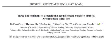 此外,课题组在径向自加速声束中引入了不对称贝塞尔的概念,从而成功地推导了在自由空间中传播的声学径向自加速非对称贝塞尔声束的解析表达式。设计了一种刻有阿基米德螺旋缝的人造板结构,用于在现实中产生这种自加速声束。相关成果以“Three-dimensional self-accelerating acoustic beam based on artificial Archimedean-spiral slits”为题发表在Physical Review Applied期刊上。文章第一作者是南师大物科院陈帝超老师,吴大建教授和南京大学刘晓峻教授为论文共同通讯作者。Physical Review Applied是国际应用物理权威期刊、中科院二区期刊。