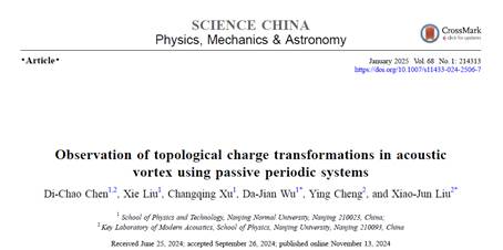 近日,物科院吴大建教授课题组在声学涡旋波束调控与应用上取得一系列重要突破。我们精心设计了双结构板外部系统来实现声涡旋嬗变。当完全旋转对称被打破为N阶离散对称时,声涡旋与有限阶离散旋转对称之间的相互作用导致其拓扑荷数发生转变。该成果证明了基于被动人工结构的声涡旋嬗变,在粒子操纵和信息复用方面具有广泛的应用,并促进了对自由空间声涡旋的理解和控制。研究结果以“Observation of topological charge transformations in acoustic vortex using passive periodic systems”为题在SCIENCE CHINA Physics, Mechanics & Astronomy期刊上发表,文章第一作者是南师大物科院陈帝超老师,吴大建教授和南京大学刘晓峻教授为论文共同通讯作者。SCIENCE CHINA Physics, Mechanics & Astronomy是中科院一区期刊。