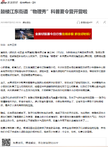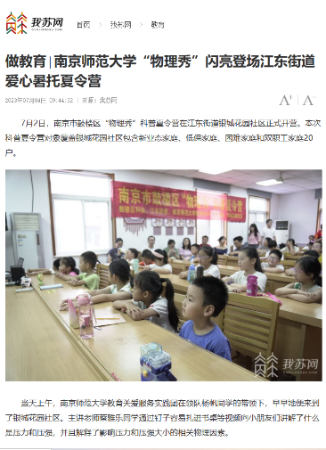 “科普助力成长,科技筑梦未来”,为大力弘扬科学精神,普及科学知识,促进科技创新和科学普及的协调发展,“心怀桑榆,教育先行”教育关爱服务实践团在南京市鼓楼区江东街道银城花园社区组织了为时八天的“物理秀”科普夏令营。
