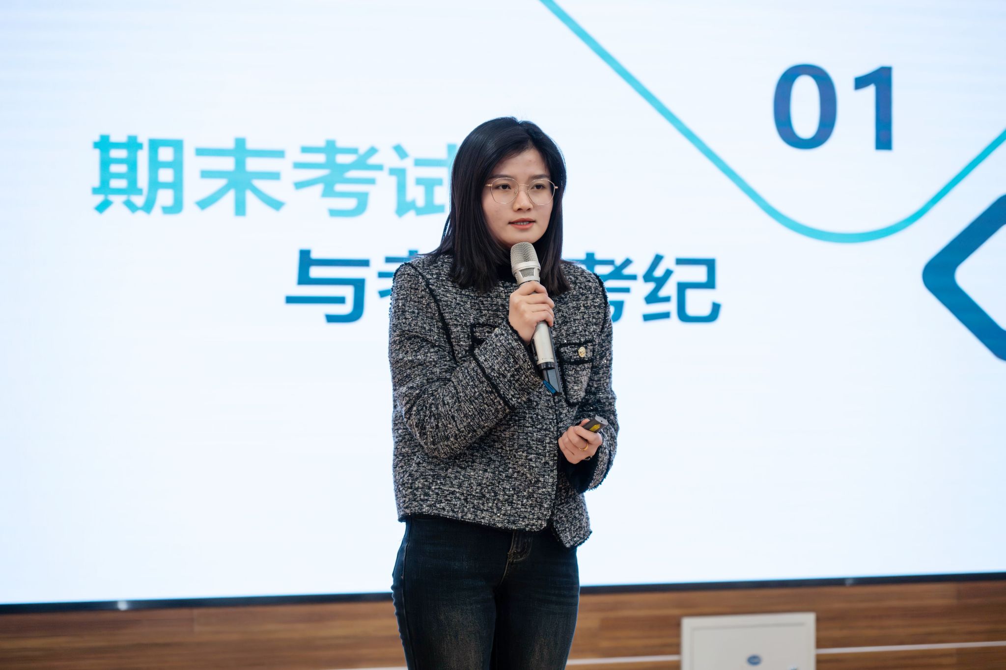 本科学生违纪处分办法》逐条为大家梳理,明晰规则和红线。同时她也将考试的具体时间安排呈现给同学们,帮助大家规划好考试日程,做足考前准备。最后,陈老师提醒同学们要认真复习,专心备考,积极应对各种挑战,争取在期末考试中取得满意的成绩。
