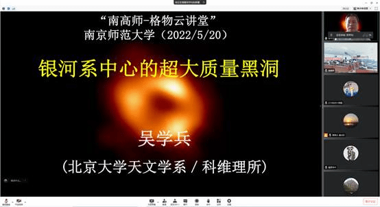 启动品牌系列讲座“南高师·格物云讲堂”,邀请国内外中青年杰出物理学家主讲。近些年黑洞,尤其是银河系中心超大质量黑洞的研究得到了飞速的发展。特别是在5月12号,科学家发布了银河系中心黑洞的首张照片。在此背景下,物科院于2022年5月20日,邀请到北京大学吴学兵教授在腾讯会议、蔻享直播会议室开讲,作了题为“银河系中心的超大质量黑洞”的学术报告。本次报告由物科院院长张力发教授主持,物科院教师、本科生、研究生共计160多人在行健楼435会议室和腾讯会议,蔻享直播平台在线观众1200多人次,参加了本次报告会。