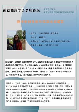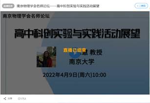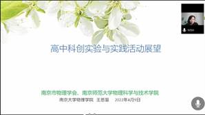2022年4月9日上午南京大学王思慧教授(我校1984届校友)通过腾讯会议和蔻享直播平台为物科院师生以及南京物理学会会员做了一场学术报告,报告题目为“高中科创实验与实践活动展望”。报告由南京市物理学会副秘书长、南京市教学研究室杨震云教研员和物科院朱瑞林副教授共同主持,腾讯会议和蔻享直播平台共有千余人次在线参加了本次报告会。