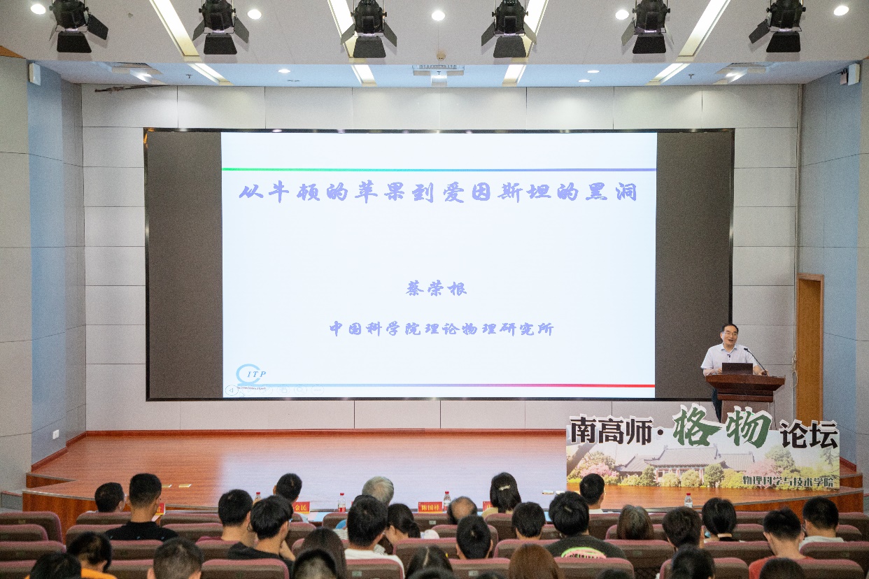 一百二十周年校庆, 从今年3月开始, 物科院启动高端品牌系列讲座 【南高师·格物论坛】,将邀请一批国内外物理学大师为学院师生开讲。本次论坛由中国科学院院士、发展中国家科学院院士、国际广义相对论和引力学会会士、中国科学院理论物理研究所研究员和所长蔡荣根院士主讲。6月24日下午, 在敬文图书馆二楼东报告厅,蔡院士为在场师生作了题为“从牛顿的苹果到爱因斯坦的黑洞”的学术讲座,讲座由物科院院长张力发教授主持。