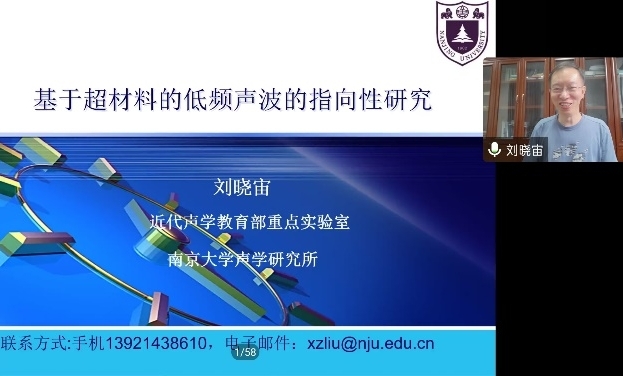 在报告之初,刘晓宙教授联系日常生活提出了低频声波在空间的定向传播问题,简述影响声波传播的因素:媒质的性质和边界条件。随后,刘晓宙教授提出声学超材料的概念,指出可以设计具有奇特声学特性的超材料来实现低频声波的强指向性,并列举:刻有周期排列的亥姆霍兹共鸣器结构、镶嵌有HR结构的板子和狭缝、Mie共振结构在低频声波指向性中的应用。最后,刘晓宙教授对低频声波的定向传输的潜在应用等进行了展望。刘晓宙教授表示,低频声波研究前景一片光明,只待更多有志青年加入。