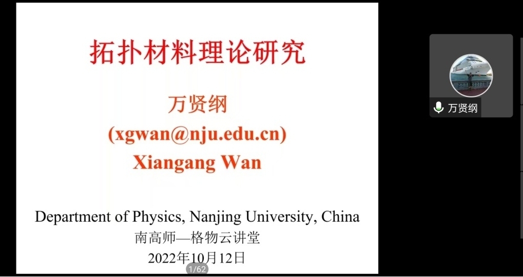 启动品牌系列讲座“南高师·格物云讲堂”,邀请国内外中青年杰出物理学者主讲。2022年10月12日,南京大学物理学院万贤纲教授在腾讯会议、蔻享直播会议室开讲,作了题为“拓扑材料理论研究”的学术报告。本次报告由物科院院长张力发教授主持,物科院教师、本科生、研究生及蔻享在线观众,共计1000余人参加了本次报告会。